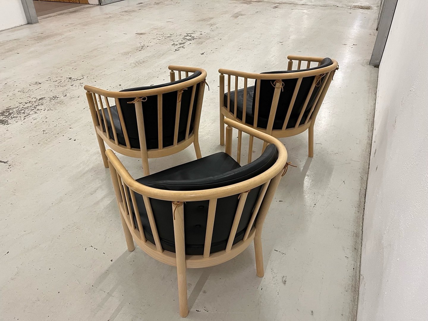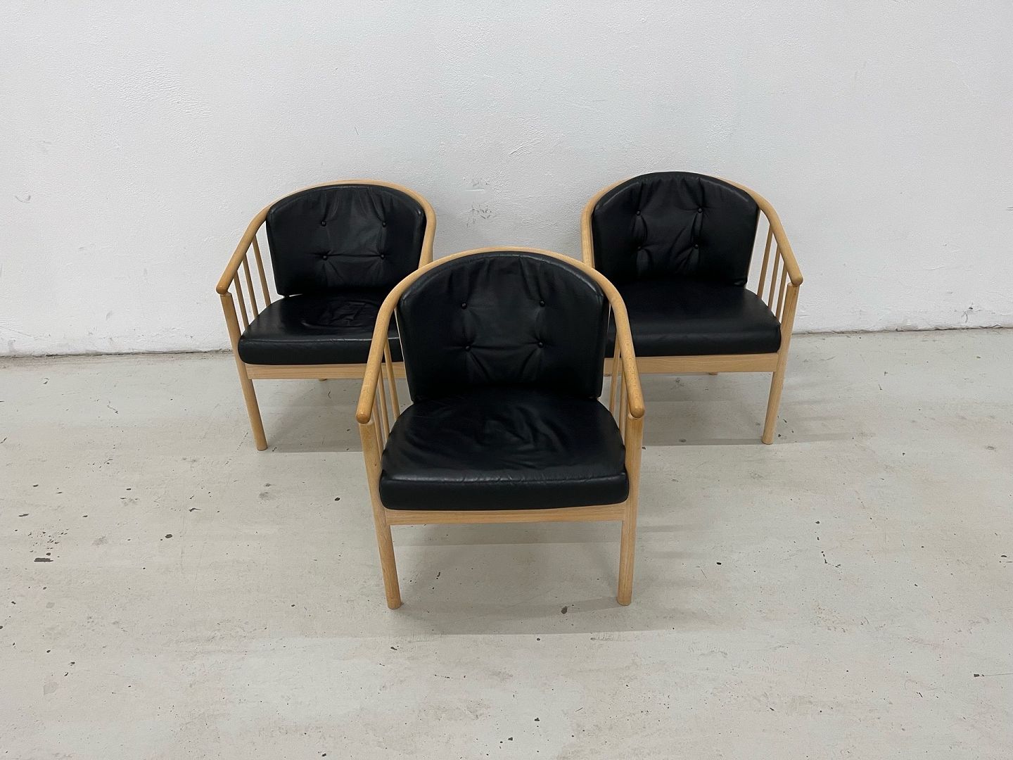 Der udbydes i alt 3 stk. Stouby Bella loungestole udført i sort semianilinlæder med stel i ubehandlet eg.