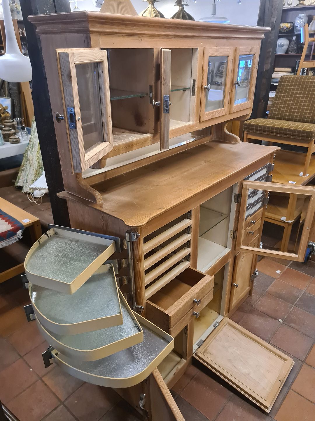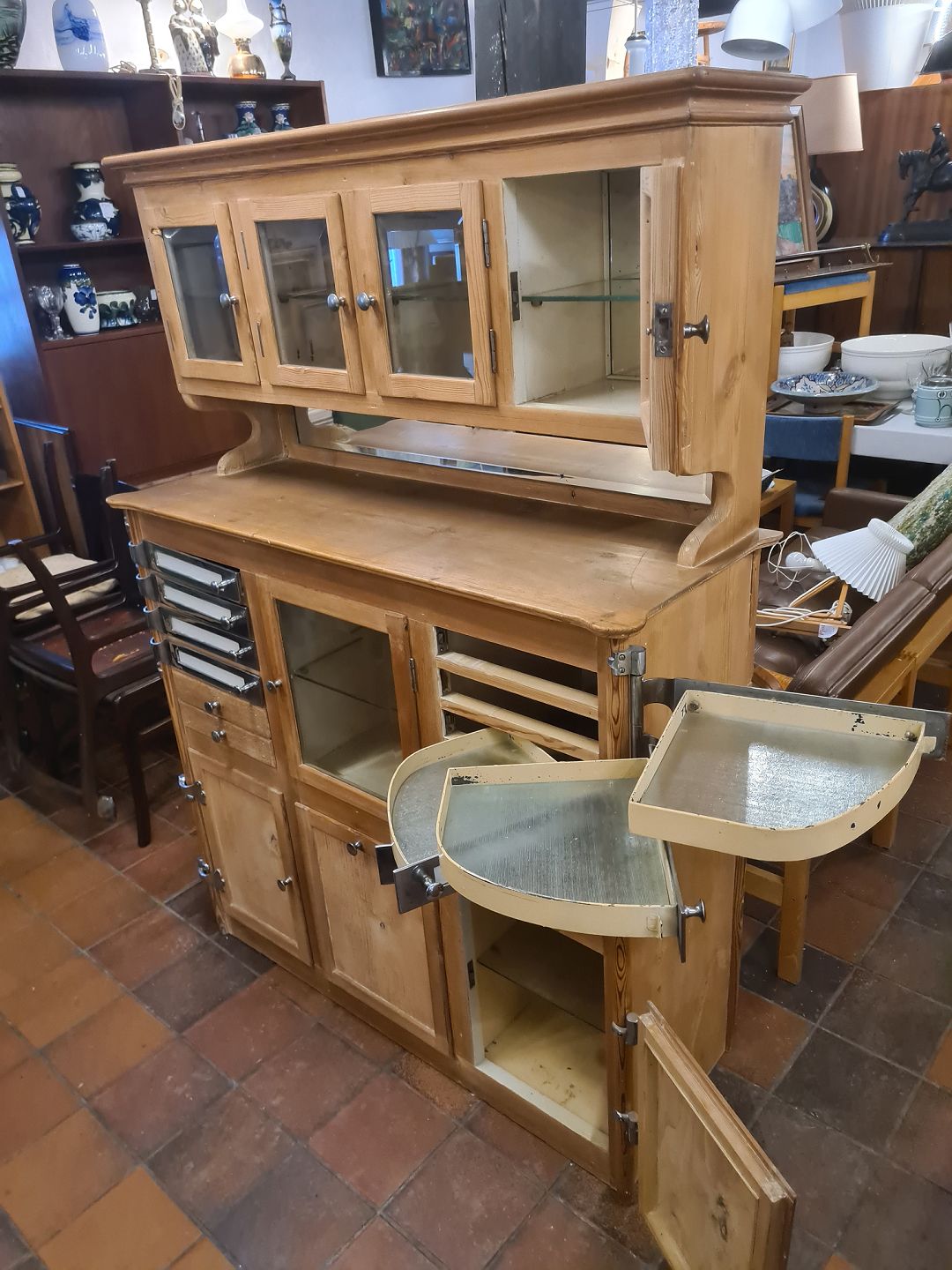 Ældre originalt tandlægeskab i fyrretræ med låger og hylder i glas og metal.Fremstillet ca. 1940'erne. Pæn brugt stand m. brusspor.