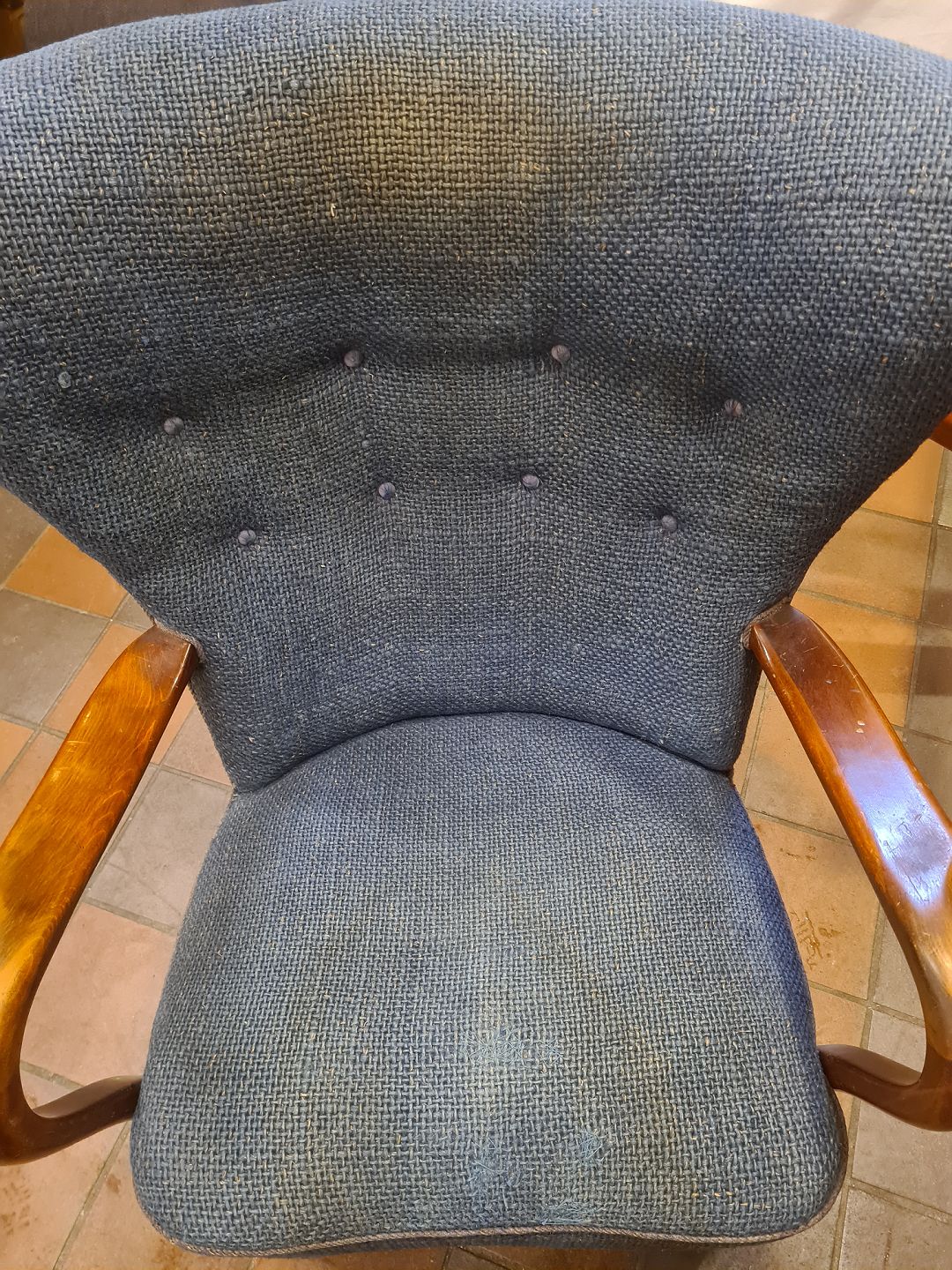 Alfred Christensen overpolstret lænestol model: 23B udført m. stel i bejdset bøg og betrukket med uld stof. Fremstillet hos Slagelse Møbelværk ca. 1950'erne.Fremstår i brugt stand, bør ombetrækkes.