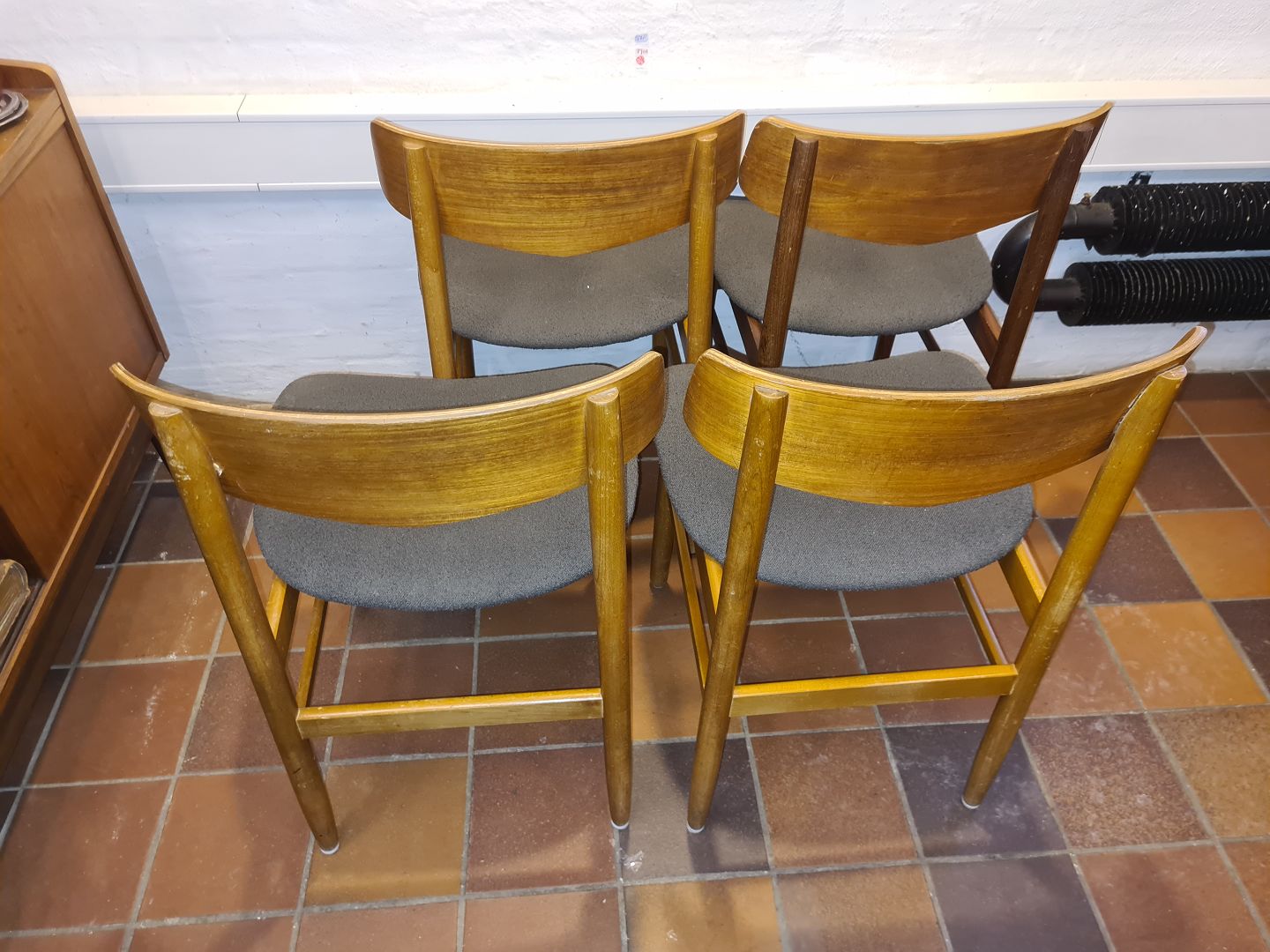 Bemærk 1 stol med stel og ryg i teak. 3 stole med ryg stykke i teak og sel i bøg.
