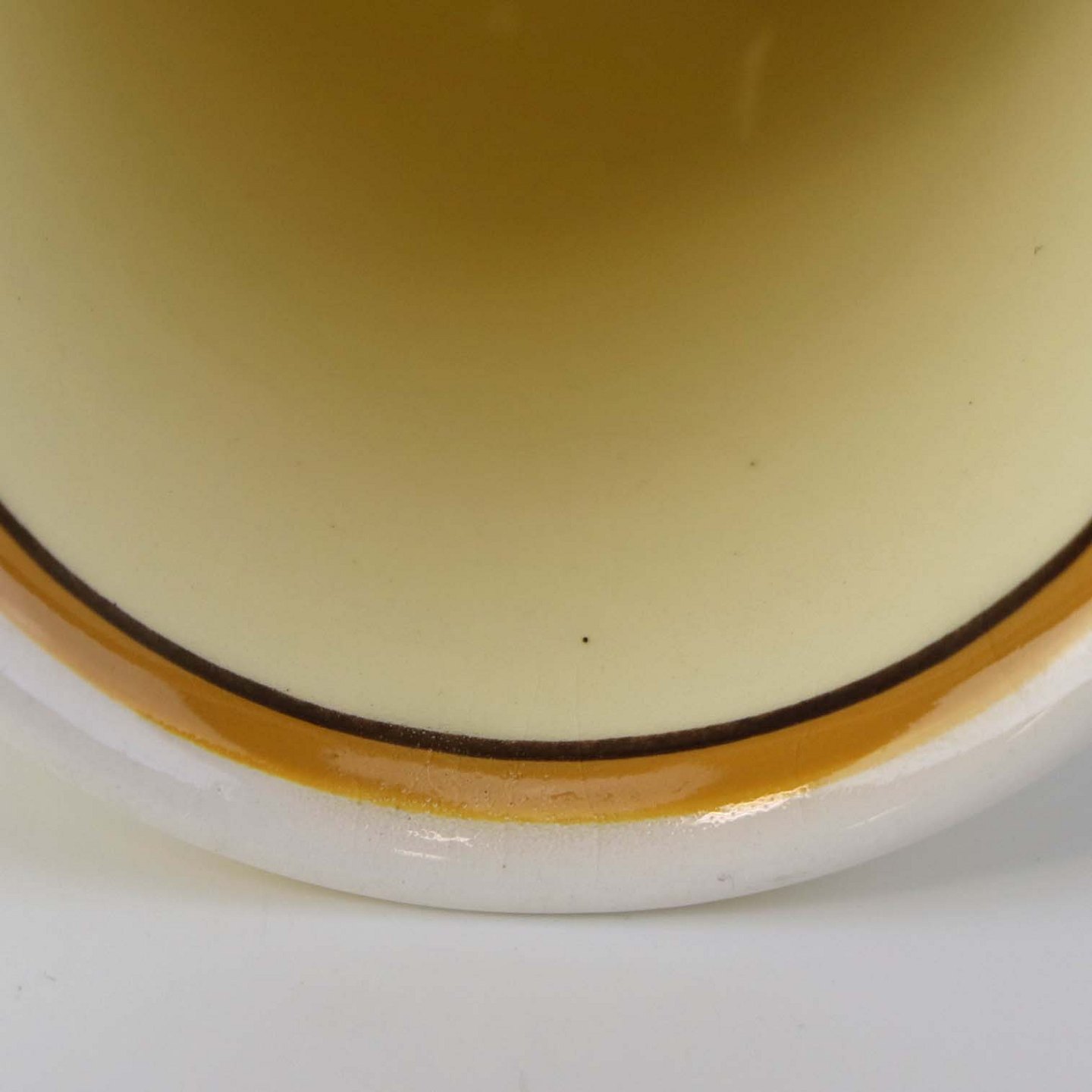 Glat fajancestel med dekoration i brune og gule farver på lys bagggrund med mørkebrun streg.