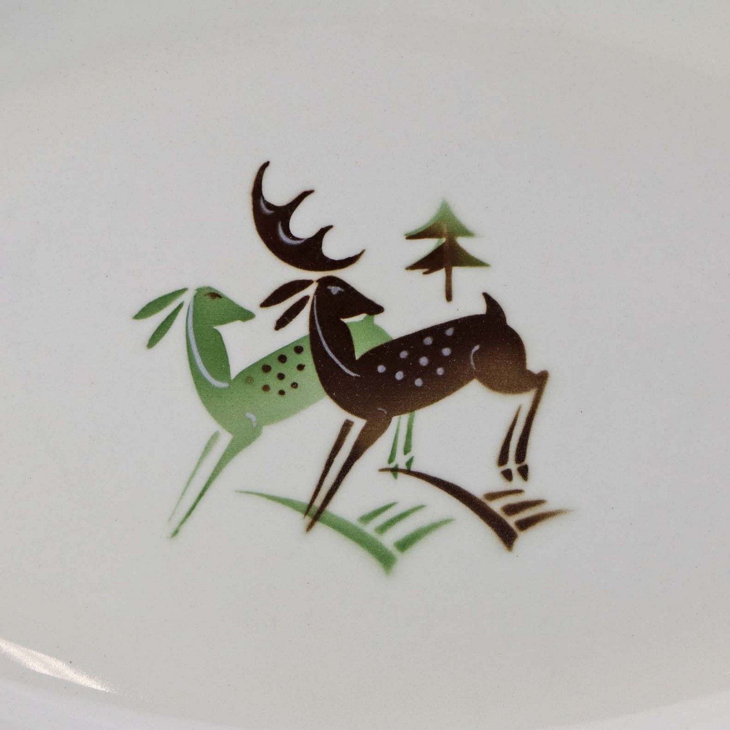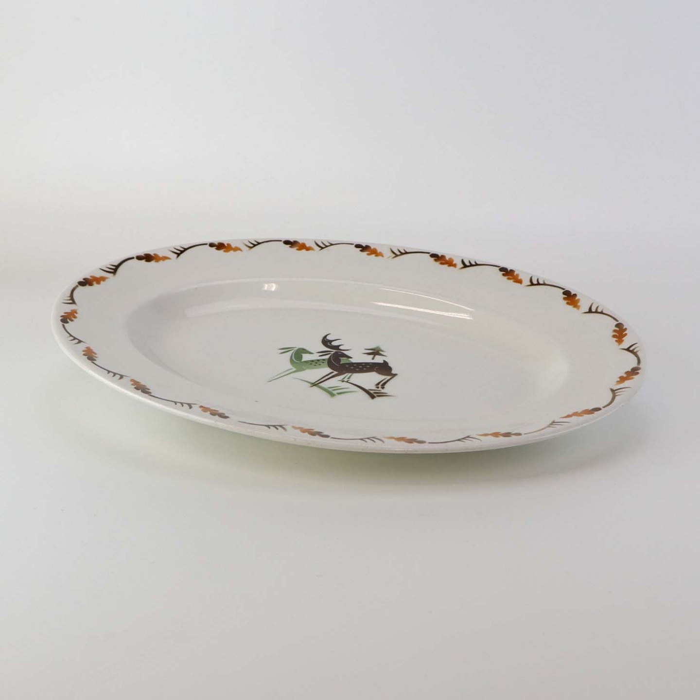 Fajancestel i stelform C med dekoration af grøn og brun hjort på lys baggrund med kantbort af blade i brune nuancer.