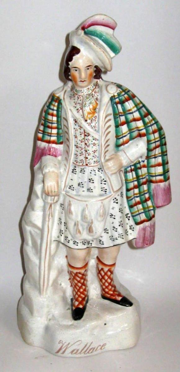 Staffordshire figur, 19. årh. England. Fajance. Polykrom dekoration forestillende den skotske oprørsleder William Wallance, der rejste Skotland mod englænderne i 1297. H.: 39 cm.Figuren er fuldstændig identisk med lot 29.006, hvor figuren derimod forestiller kong Robert Bruce af Skotland. Det er kun navnet på foden, der er forskellig.