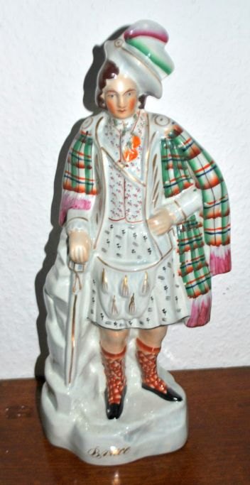 Staffordshire figur, 19. årh. England. Fajance. Polykrom dekoration forestillende den skotske konge Robert Bruce. Navnet er på foden. H.: 38 cm.Robert Bruce var konge over Skotland og slog kong Edward II in Bannockburn i 1314 og lavede fred i 1328. Han var inspirationskilde til en opera af Rossini opført i 1846. Her ses kongen i fuld skotsk beklædning med en hånd hvilende på et sværd.