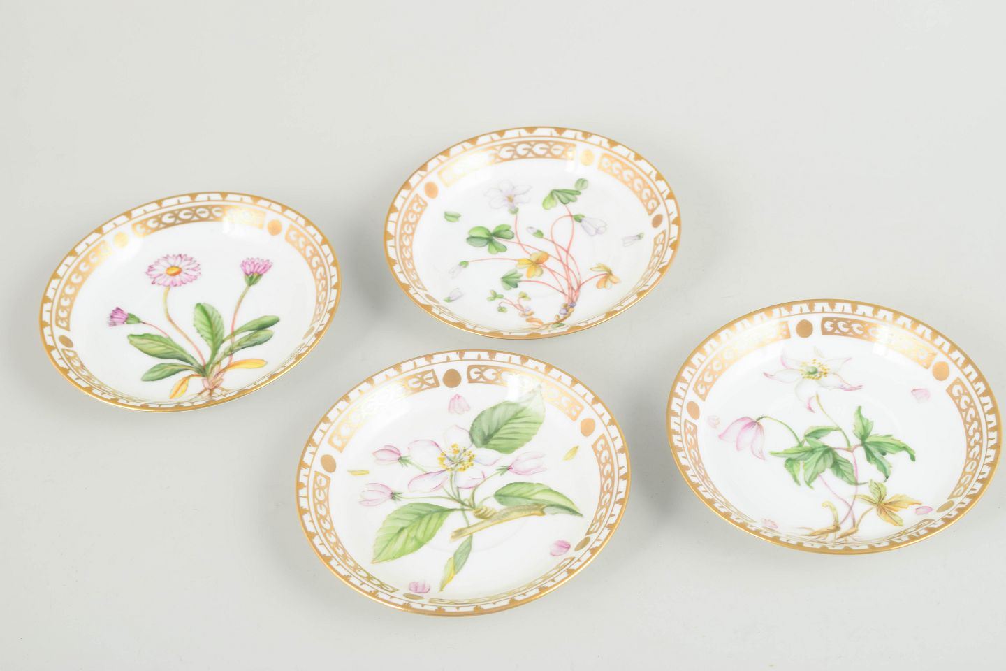 Royal Copenhagen, sæt på fire små kaffekopper med tilhørende underkopper.Porcelæn i Flora Danica-stil med håndmalede botaniske motiver og forgyldt kant.