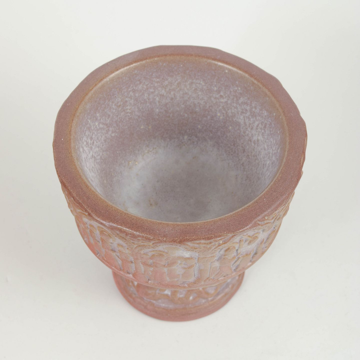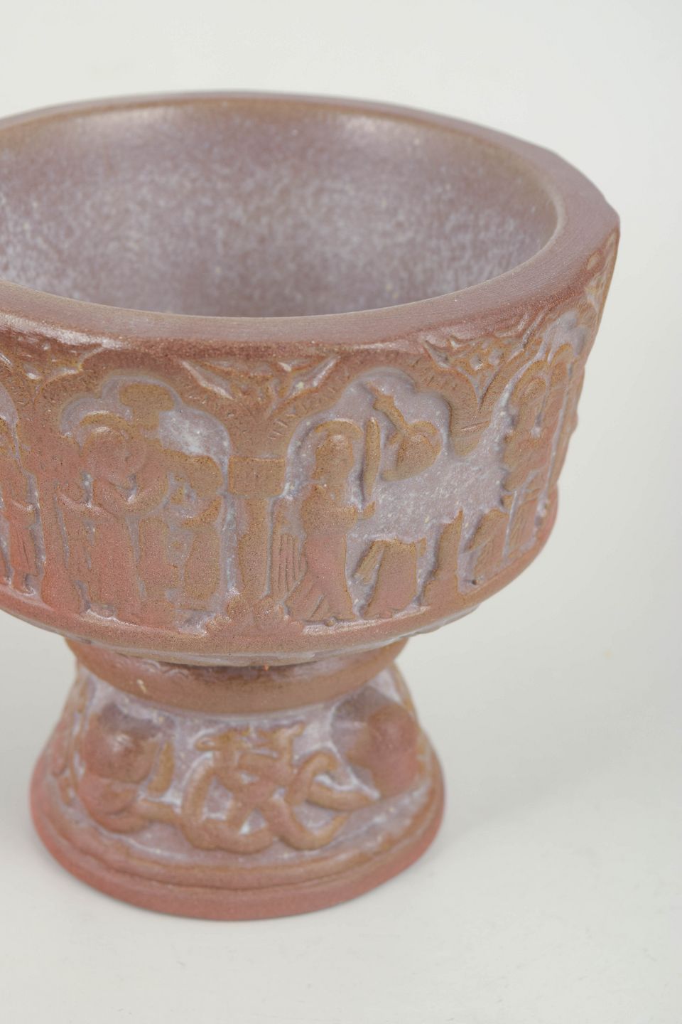 Michael Andersen & Søn, døbefont, model 4645.Reliefdekoreret stentøjsdøbefont med figural bort og profileret fod. Glaseret i varme rosa og brunlige nuancer. Udført med fabrikkens karakteristiske mærke.