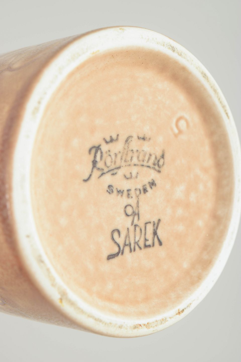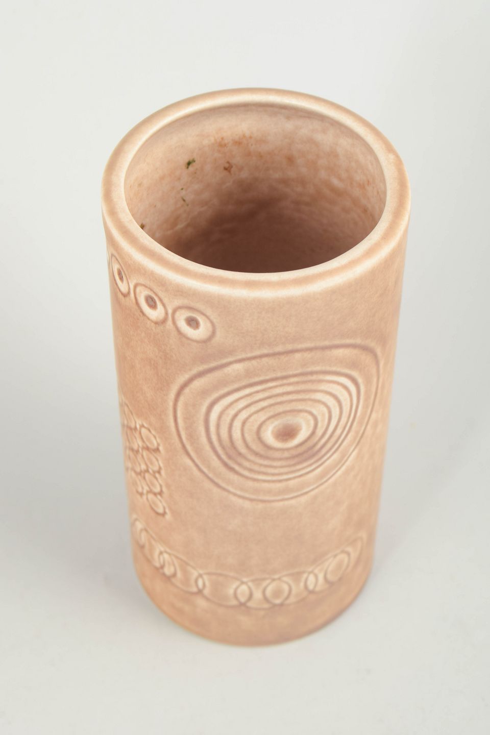 Olle Andersson for Rörstrand, vase, model “Sarek”.Cylinderformet vase i stentøj med mat, sandfarvet glasur og reliefdekoration med cirkulære og geometriske motiver. Modelnavn “Sarek” angivet i dekorationen.