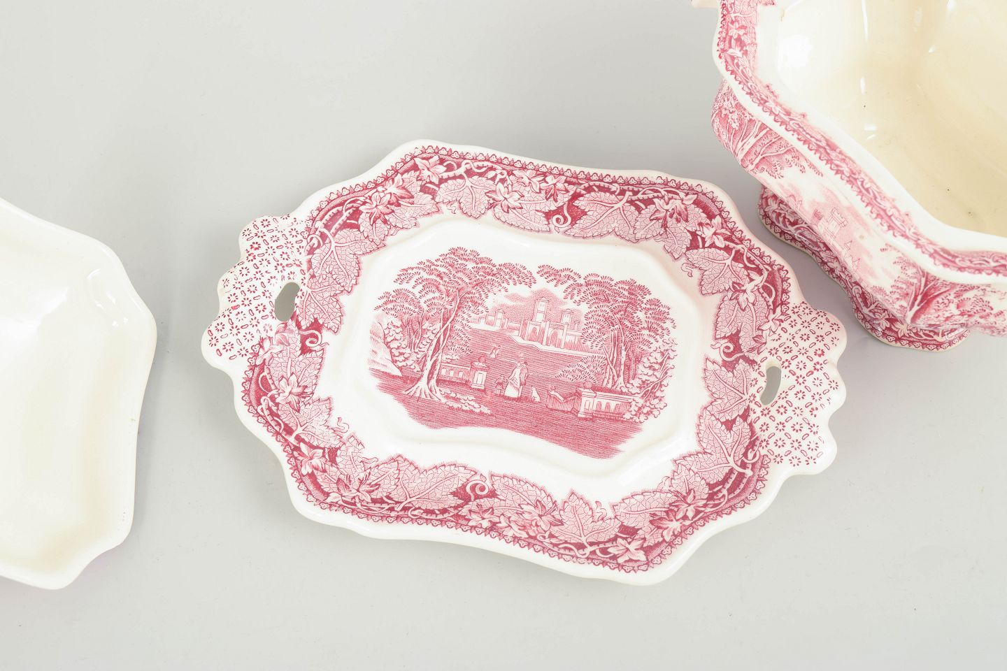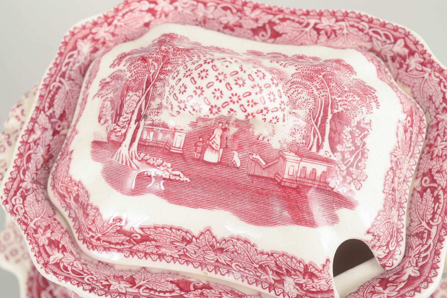 Sauceskål i fajance fra Mason’s, dekoreret i rød transferware med landskabsmotiv og ornamentale borter.