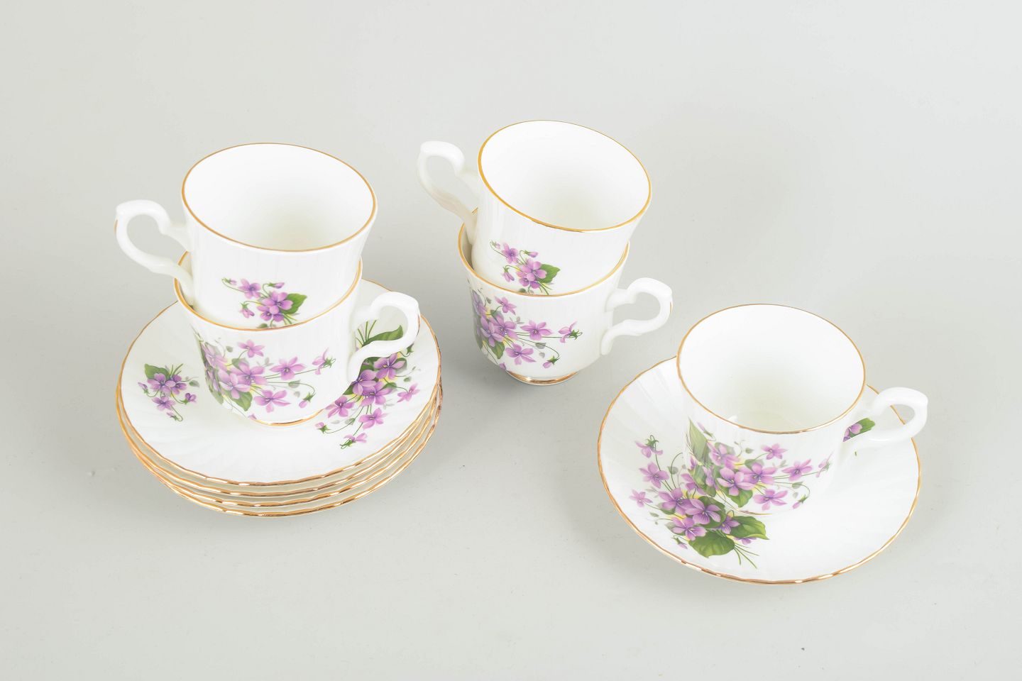 Royal Stafford, kaffesæt på 5 kopper og underkopper.Sæt på fem kaffekopper og tilhørende underkopper i benporcelæn, dekoreret med violette blomster og grønne blade samt guldkant. Fremstillet af Royal Stafford, England.