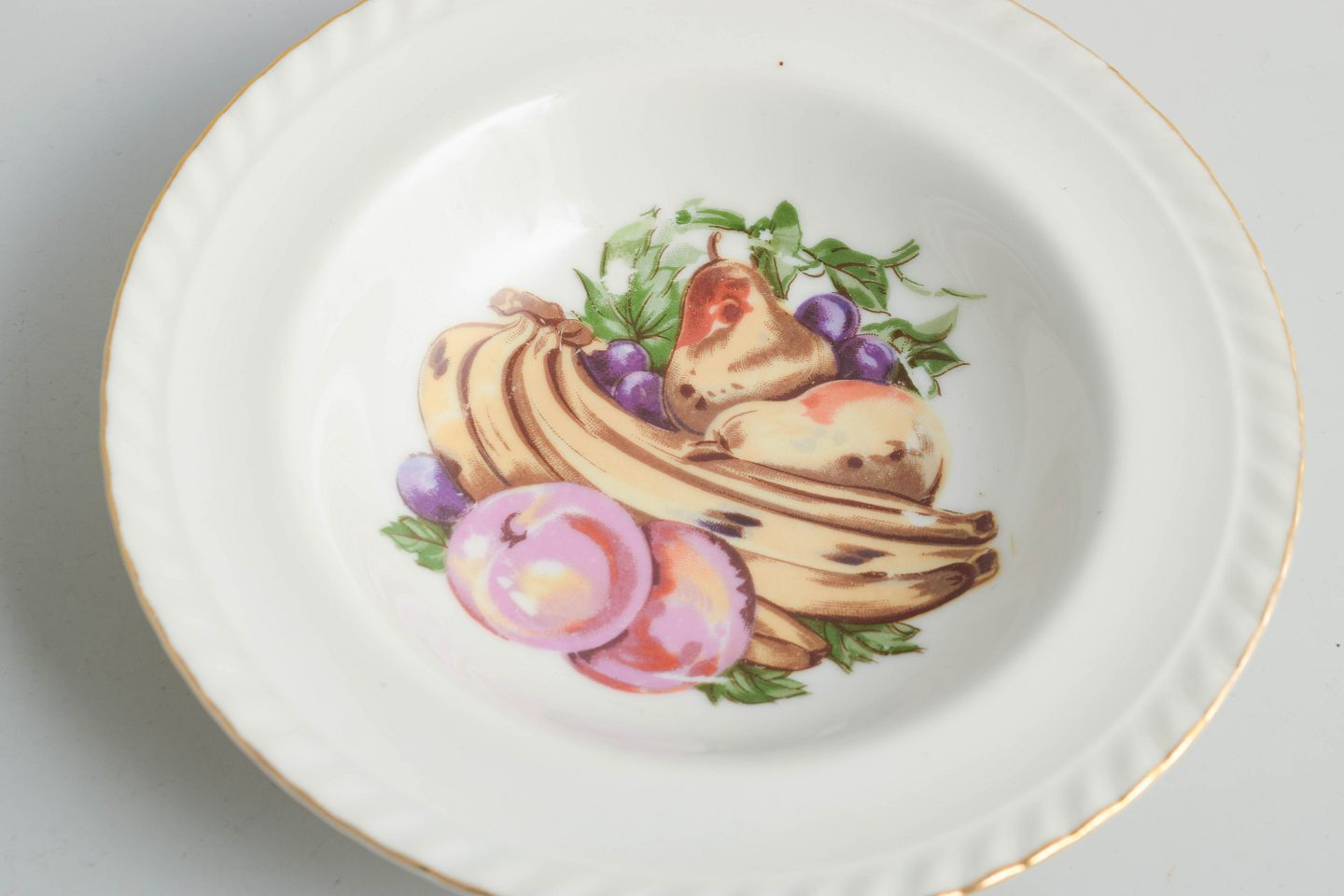 Europæisk porcelænsproducent, sæt på 6 skåle.Sæt af seks porcelænsskåle dekoreret med polykrom frugtdekoration og guldkant. Klassisk europæisk bordporcelæn i tidstypisk mellemkrigsstil. Mærket på undersiden.