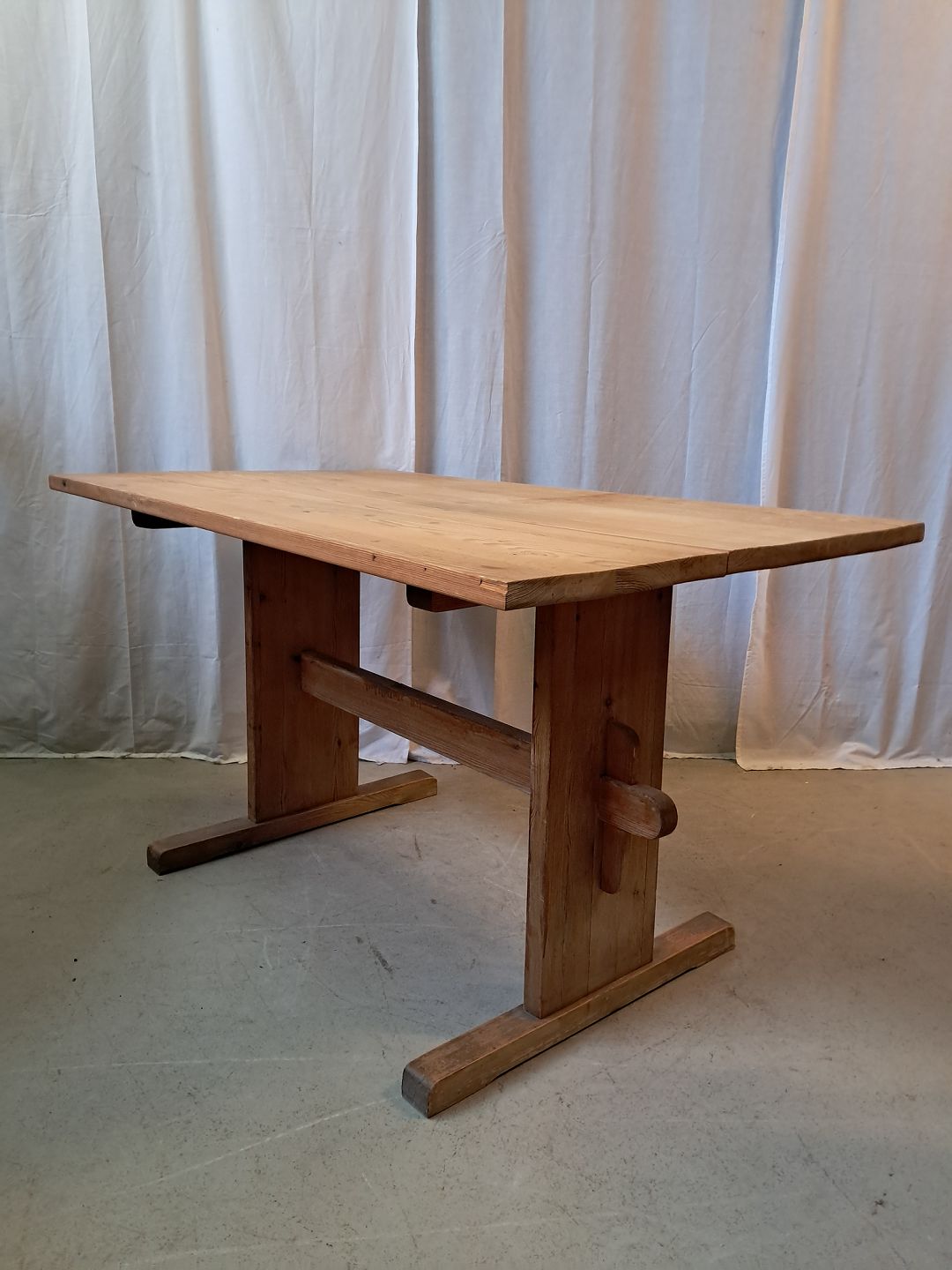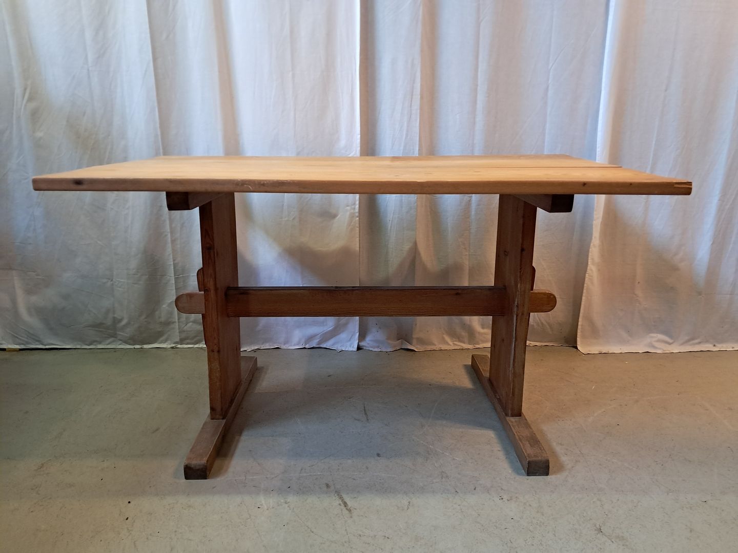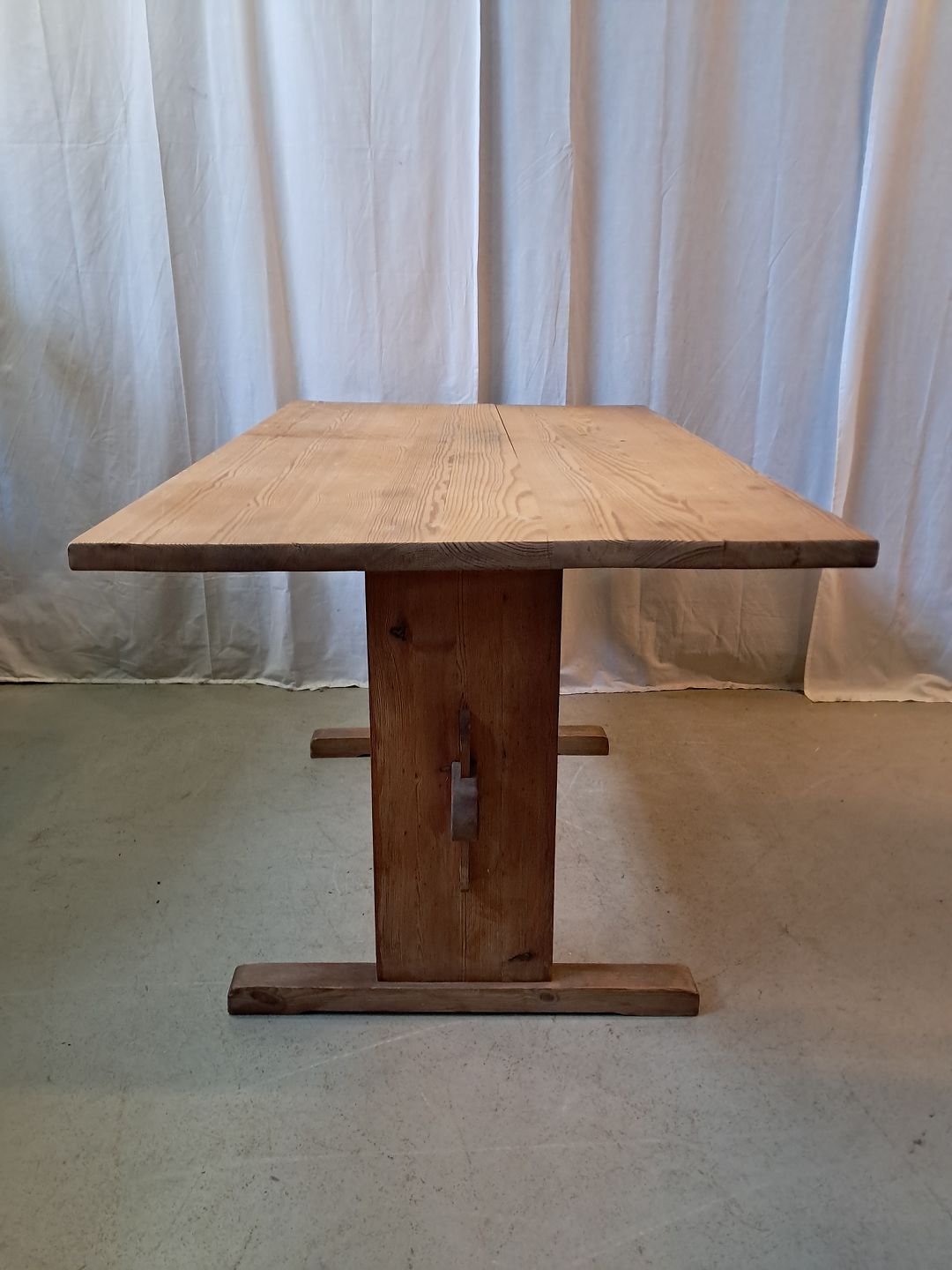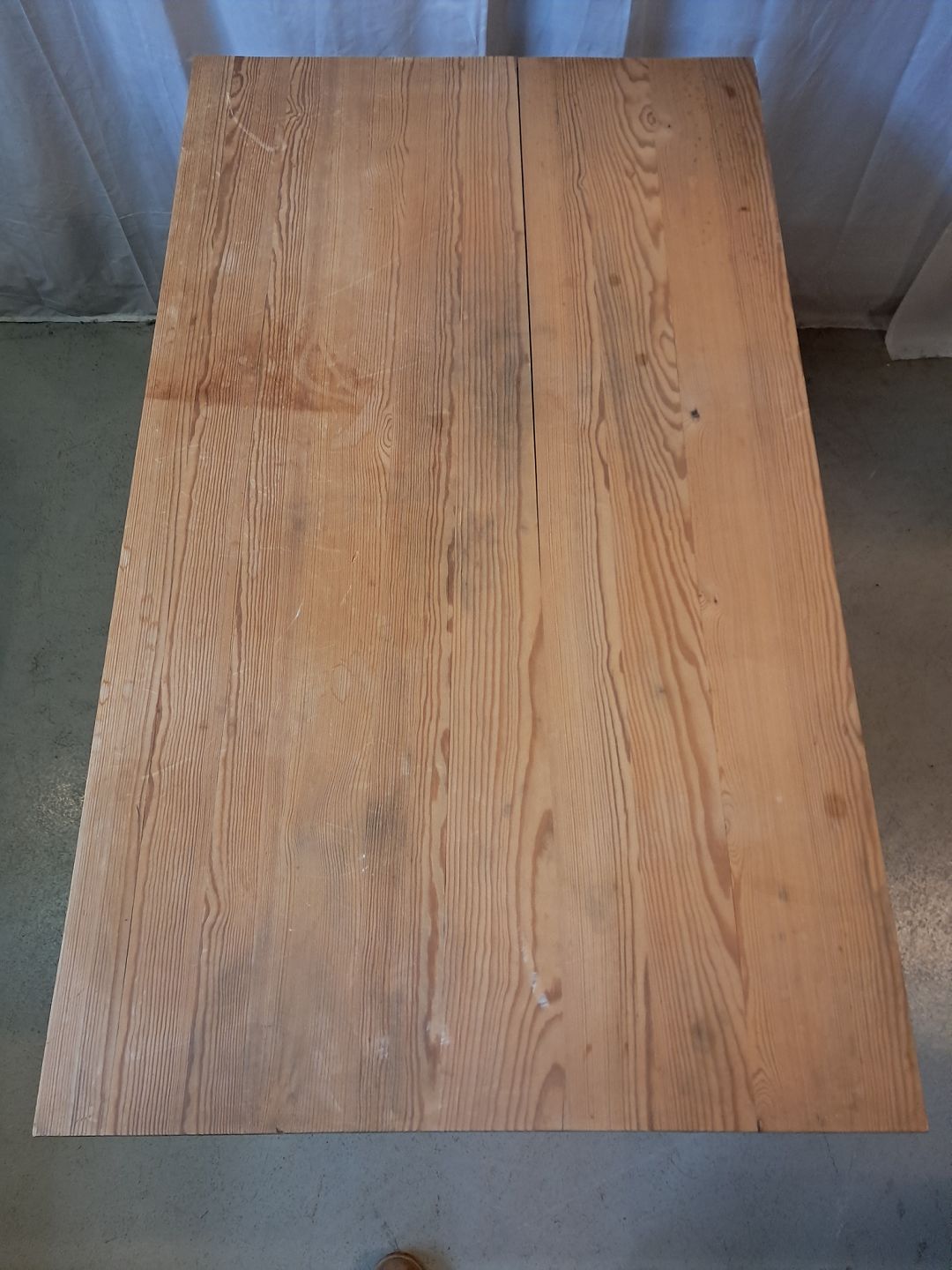 Bord i massivt fyrretræ, fra 1980erne.Det har brugsspor og en revne i bordpladen.