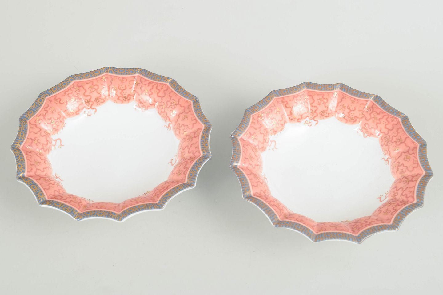 Royal Copenhagen, Fairytale, 2 skåle.To lave skåle i hvidt porcelæn dekoreret med Fairytale-mønster i bløde rosa toner langs den bølgede kant. 1. sortering. Model 351.