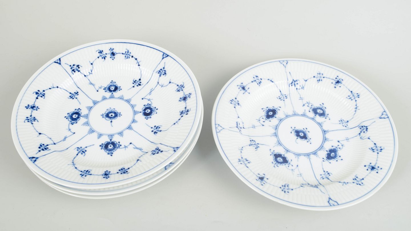 Royal Copenhagen, Musselmalet riflet, sæt på 4 middagstallerkener.Sæt på 4 middagstallerkener i hvidt porcelæn med håndmalet koboltblå musselmalet riflet dekoration. Model 1/575.