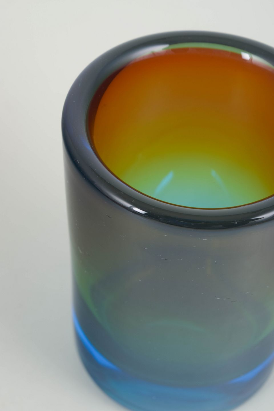 Gösta Sigvard for Lindshammars glasbruk, vase.Cylindrisk kunstglasvase i kraftigt klart glas med flerfarvet overgang i blå, grønne og varme toner. Modellen er kendetegnet ved en tung bund og jævnt slebne kanter.