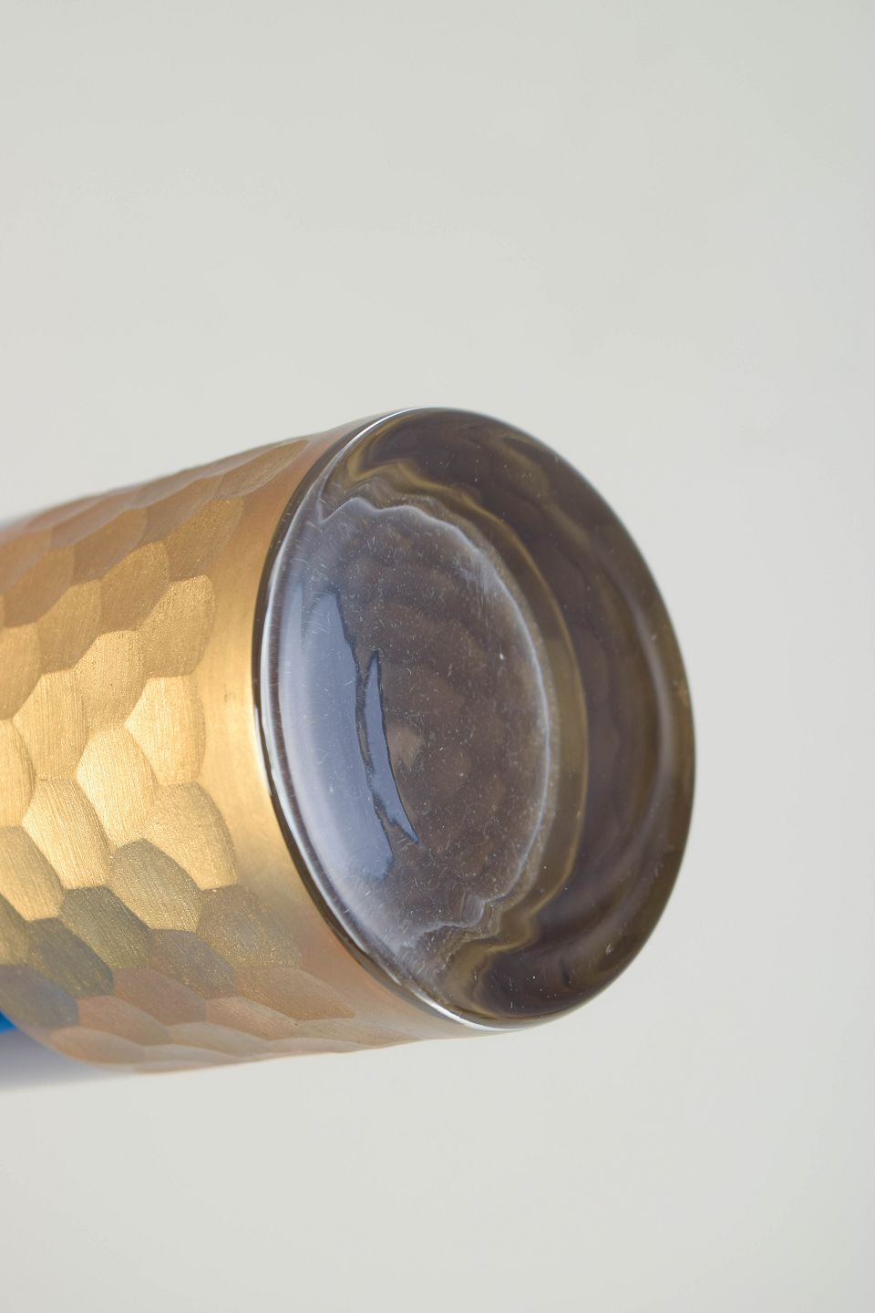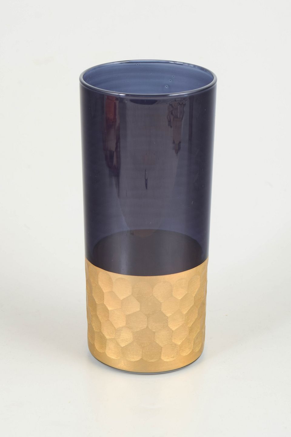 Europæisk kunstglasvase.Cylinderformet vase i mundblæst glas med klar kobaltblå overdel og kraftig bund i hamret, forgyldt metal. Enkel, stram form med tydelig kontrast mellem det transparente glas og den teksturerede metalfod. Uden signatur.