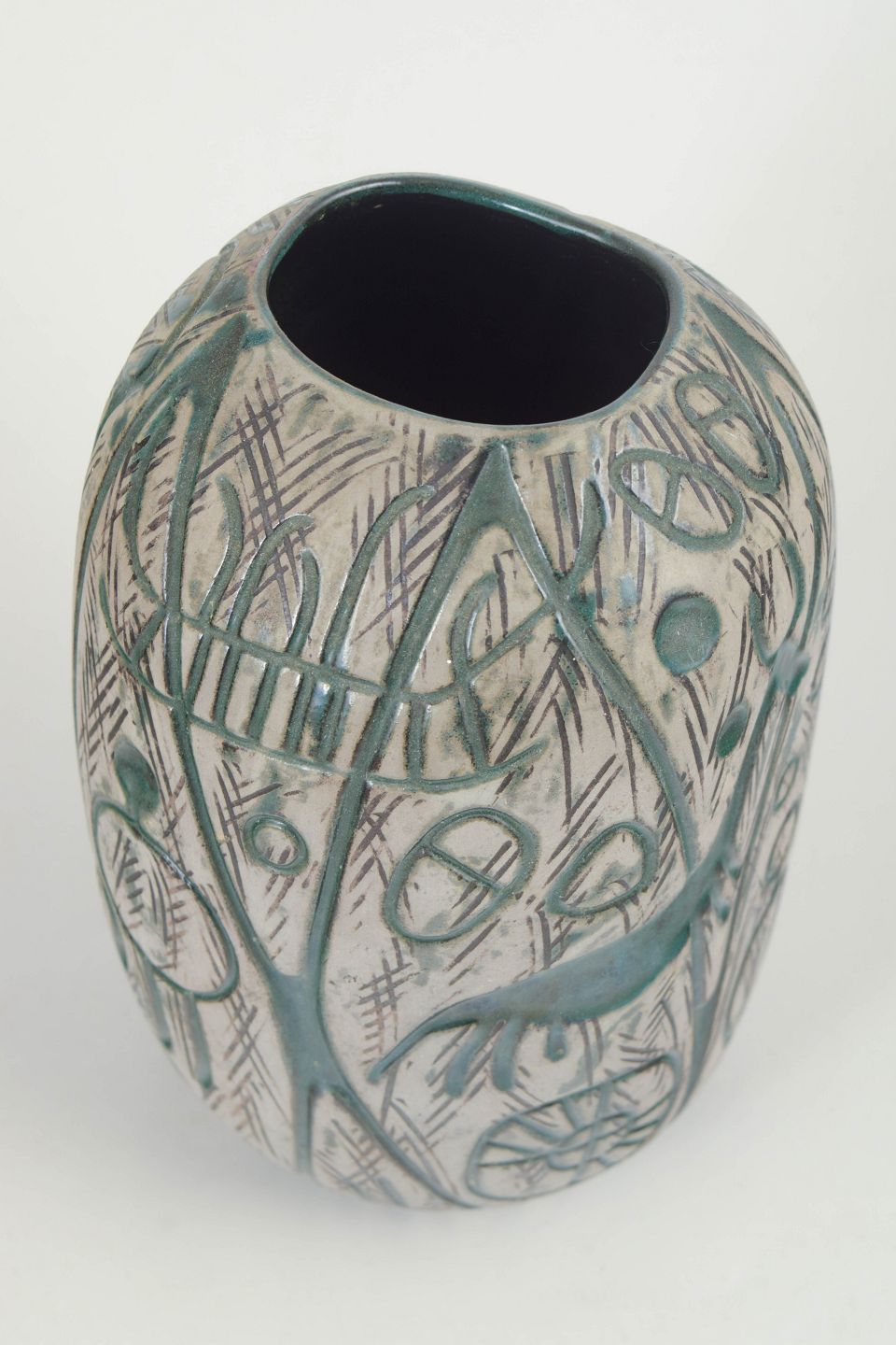 Mari Simmulson for Upsala Ekeby, "Hedenhös" vase.Dekorativ stentøjsvase med karakteristisk reliefdekoration i grønne og grå nuancer. Vasen er udført i serien Hedenhös og er formgivet med organiske linjer og indridset mønster. Model 4305.