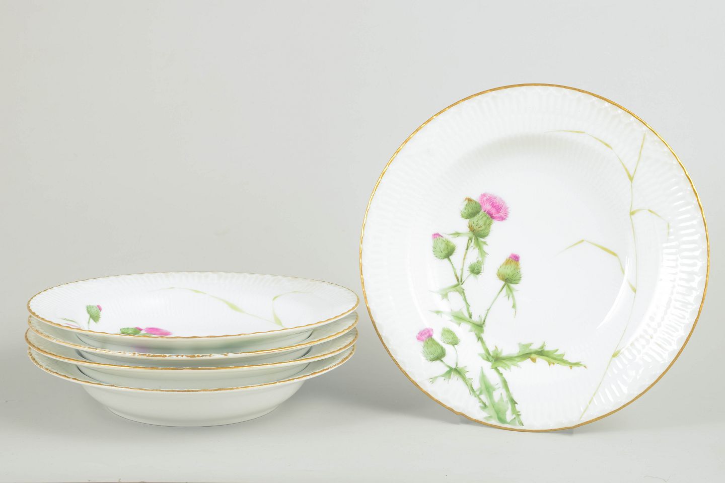 Royal Copenhagen, sæt på 5 antikke store dybe tallerkener.Håndmalede store dybe porcelænstallerkener med naturalistisk dekoration med tidselmotiv og forgyldt rand. Tallerkenerne har let riflet overflade og afspejler det høje håndværksmæssige niveau, som kendetegner Royal Copenhagens produktion i anden halvdel af 1800-tallet.