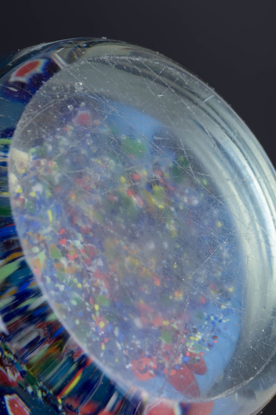 To Kugleformede brevpressere i klart kunstglas med indre farveelementer, herunder lagdelte strukturer, spredte luftbobler og dekorative indlæg i kontrasterende farver. Uden signatur.