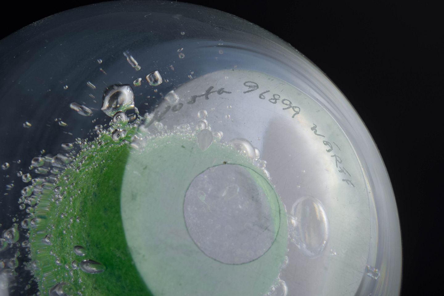 Göran Wärff for Kosta Boda, brevpressere.To Kugleformede brevpressere i klart kunstglas med indkapslede grønne og blå farvefelter samt kontrollerede luftbobler.