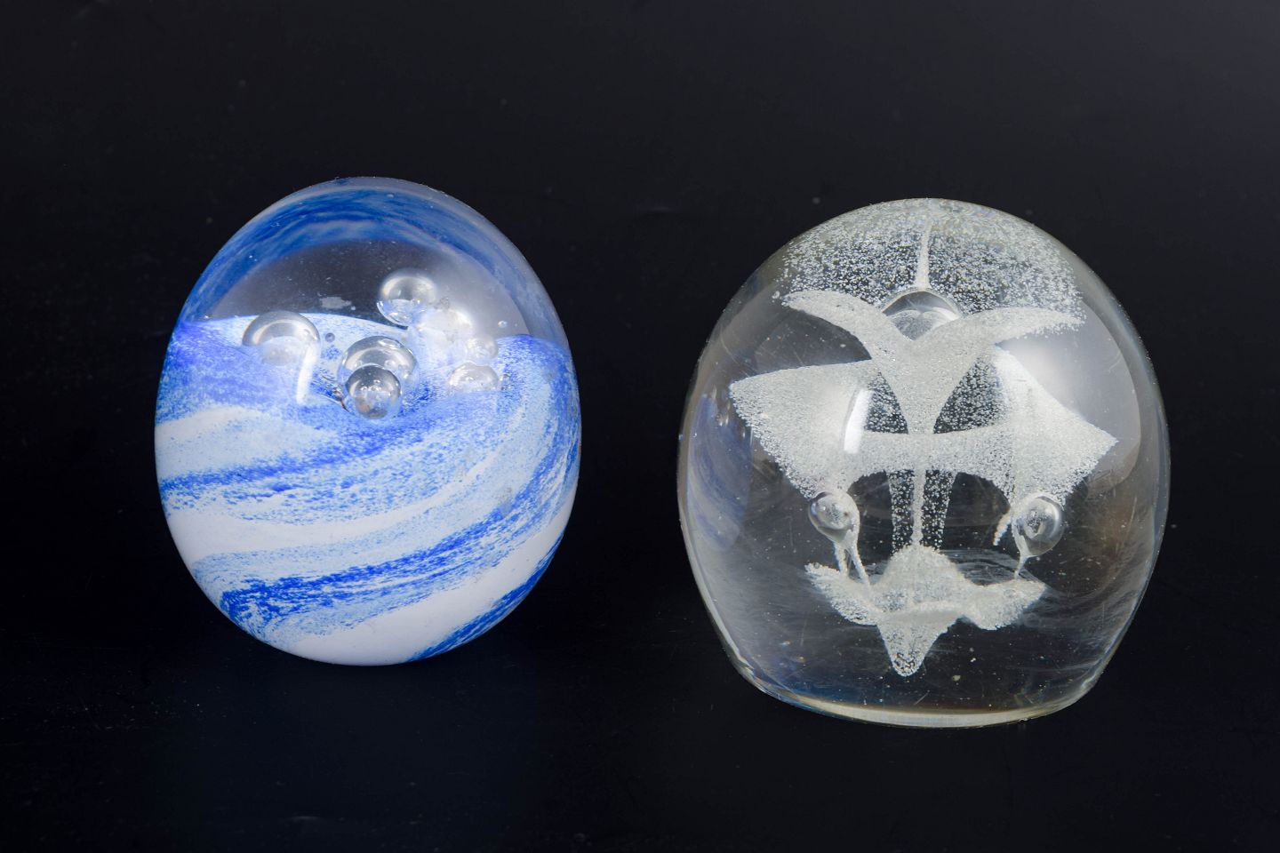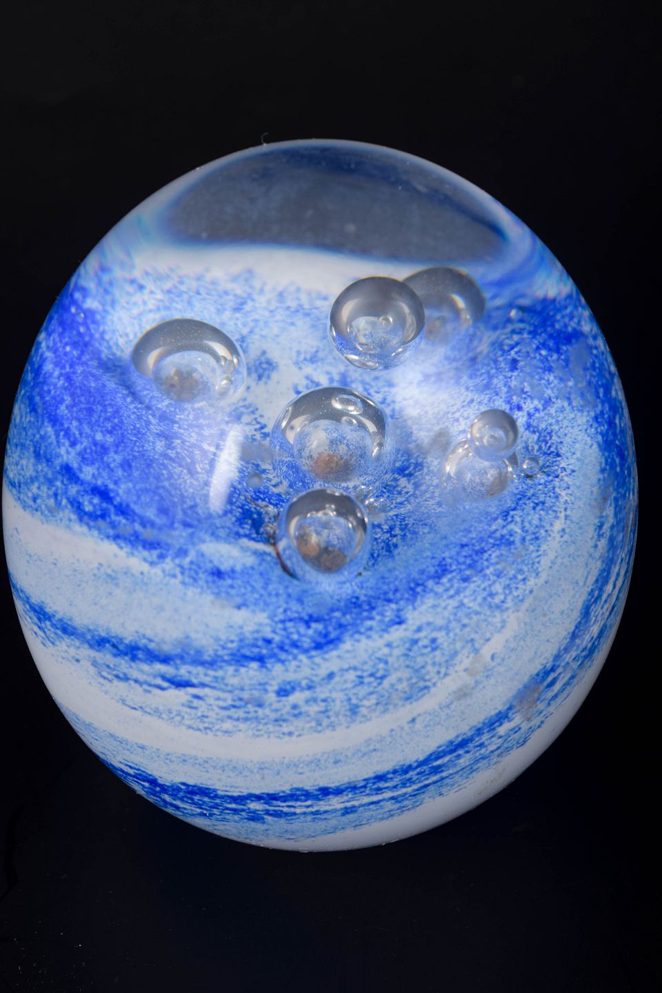 Åhus, Sverige og ubekendt, brevpresser.Organisk formet brevpresser i klart kunstglas med indre blå og hvide slør samt indkapslede luftbobler. Signeret i bunden “Studio Åhus, NK 1915–1990”.