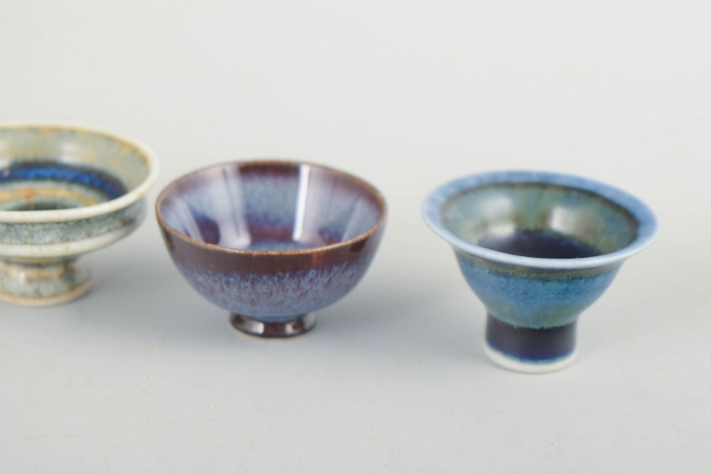 John Andersson for Höganäs Keramik, sæt af fire unikke miniature skåle.Sæt af fire unikke miniature skåle i drejet stentøj med individuelle glasurer i afdæmpede blå, grønne og violette toner. Alle skåle er signeret med monogram JA på bunden.