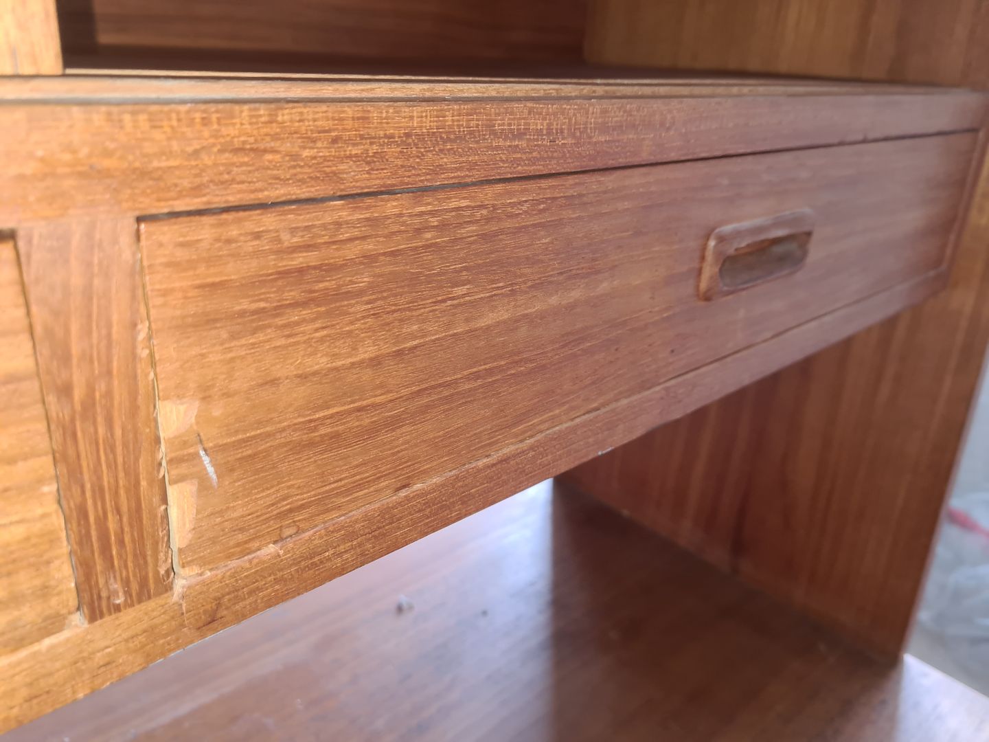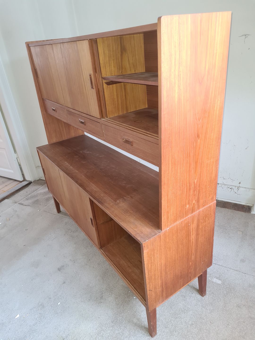 Dobbelt skænk fra 1960'erne i teakfinér. Fremstår pæn og ok velholdt, dog med manglende hylde nederst til højre og enkelte finér skader. (Billede)Højde 162 cm. Bredde 167 cm. Dybde 50 cm.