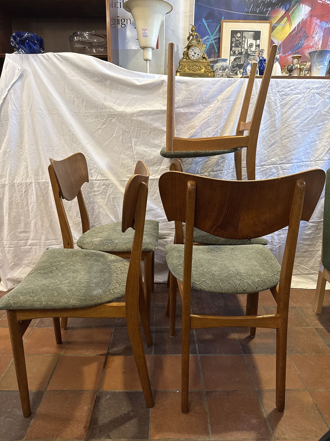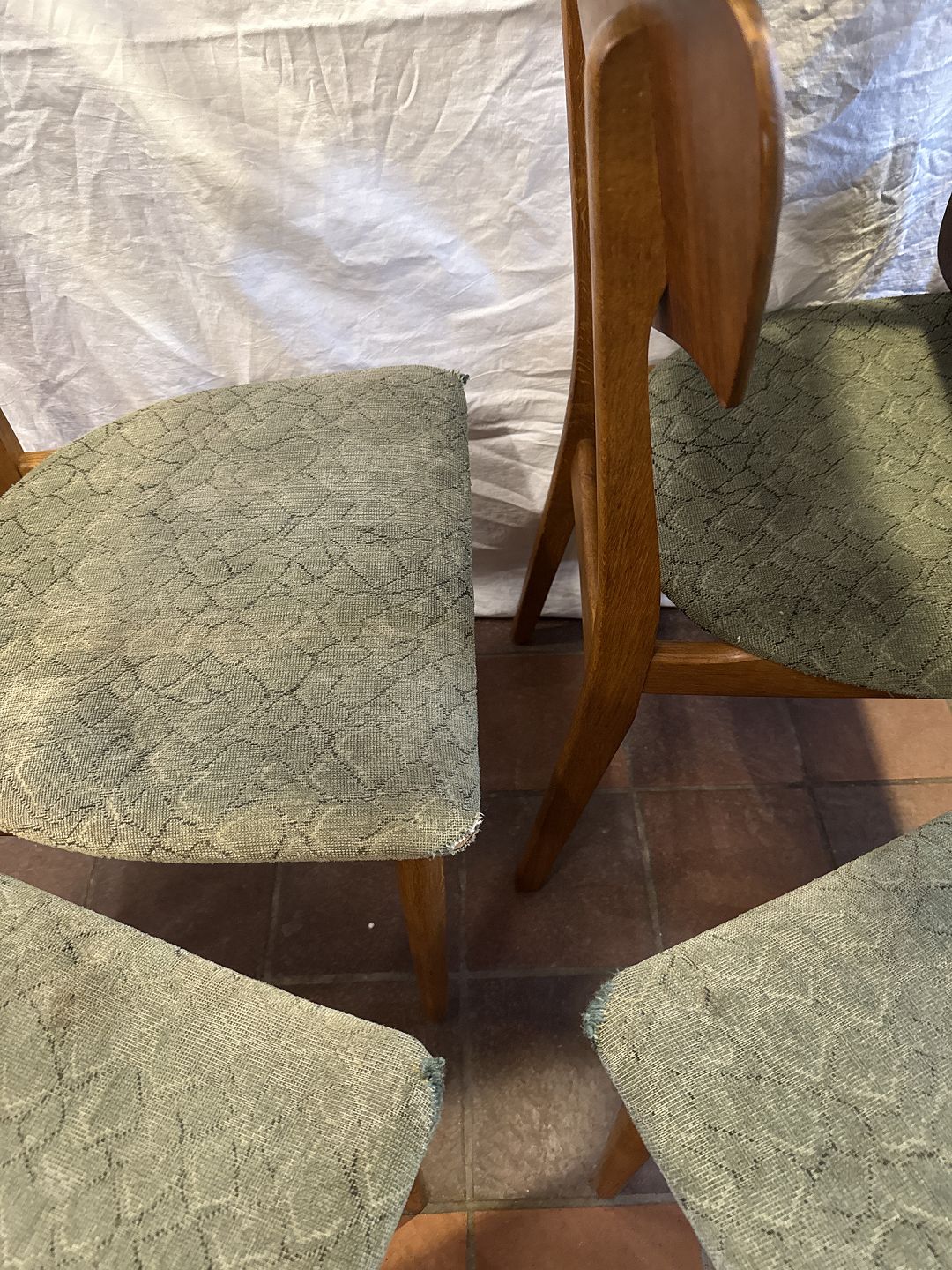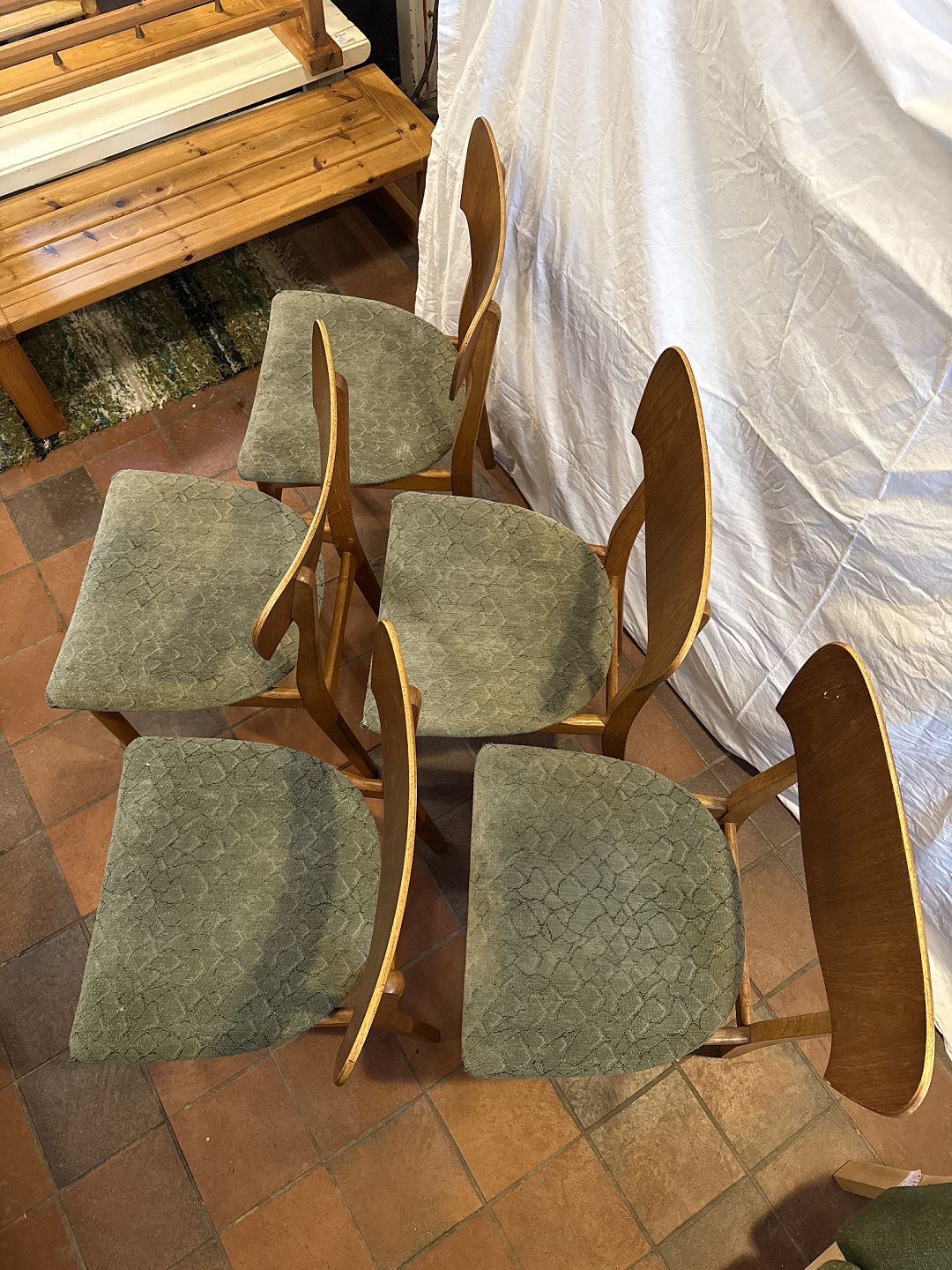 Dansk møbelproducent sæt af 5 spisestuestole i eg m. rygstykke i fineret teak samt sæde betrukket med stof. Fremstillet ca. 1950'erne.Pæn brugt stand, bør ombetrækkes.