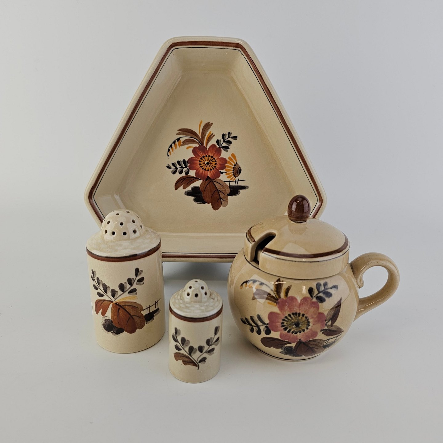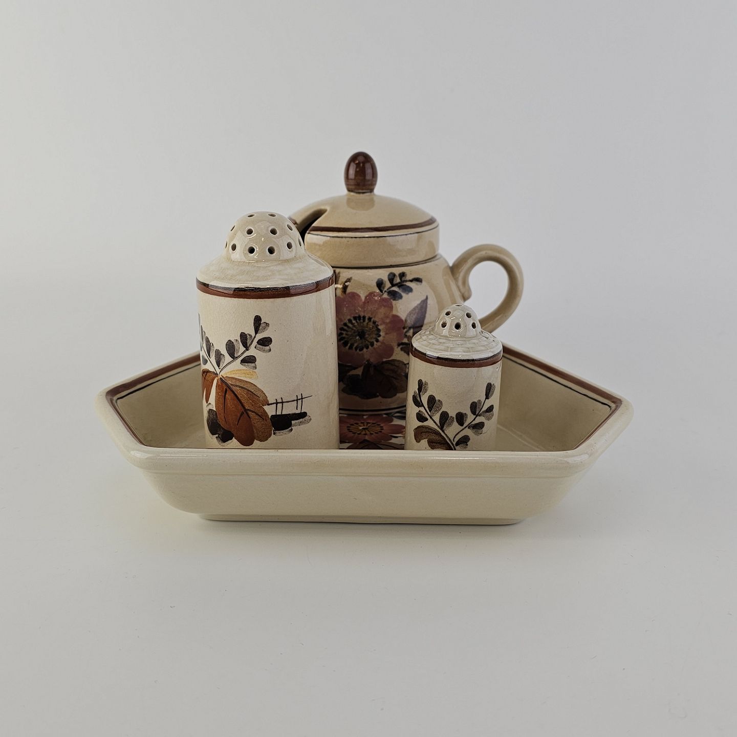 Plat de menage med peberbøsse, saltbøsse og sennepskrukke i fajance fra stellet KnudDesign Nils Thorsson