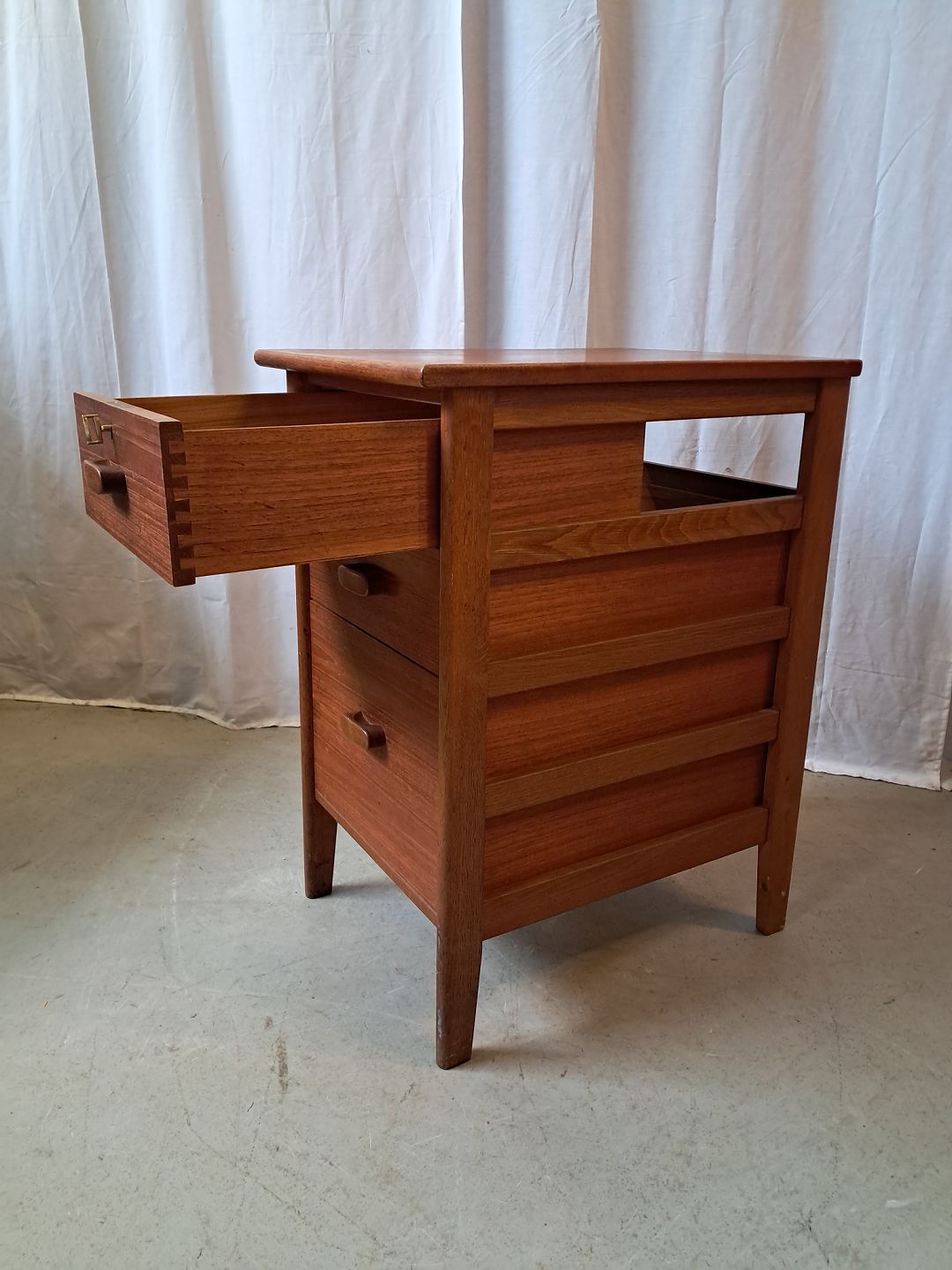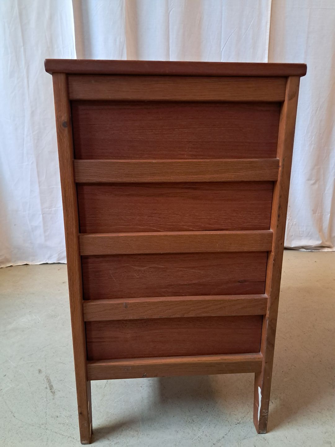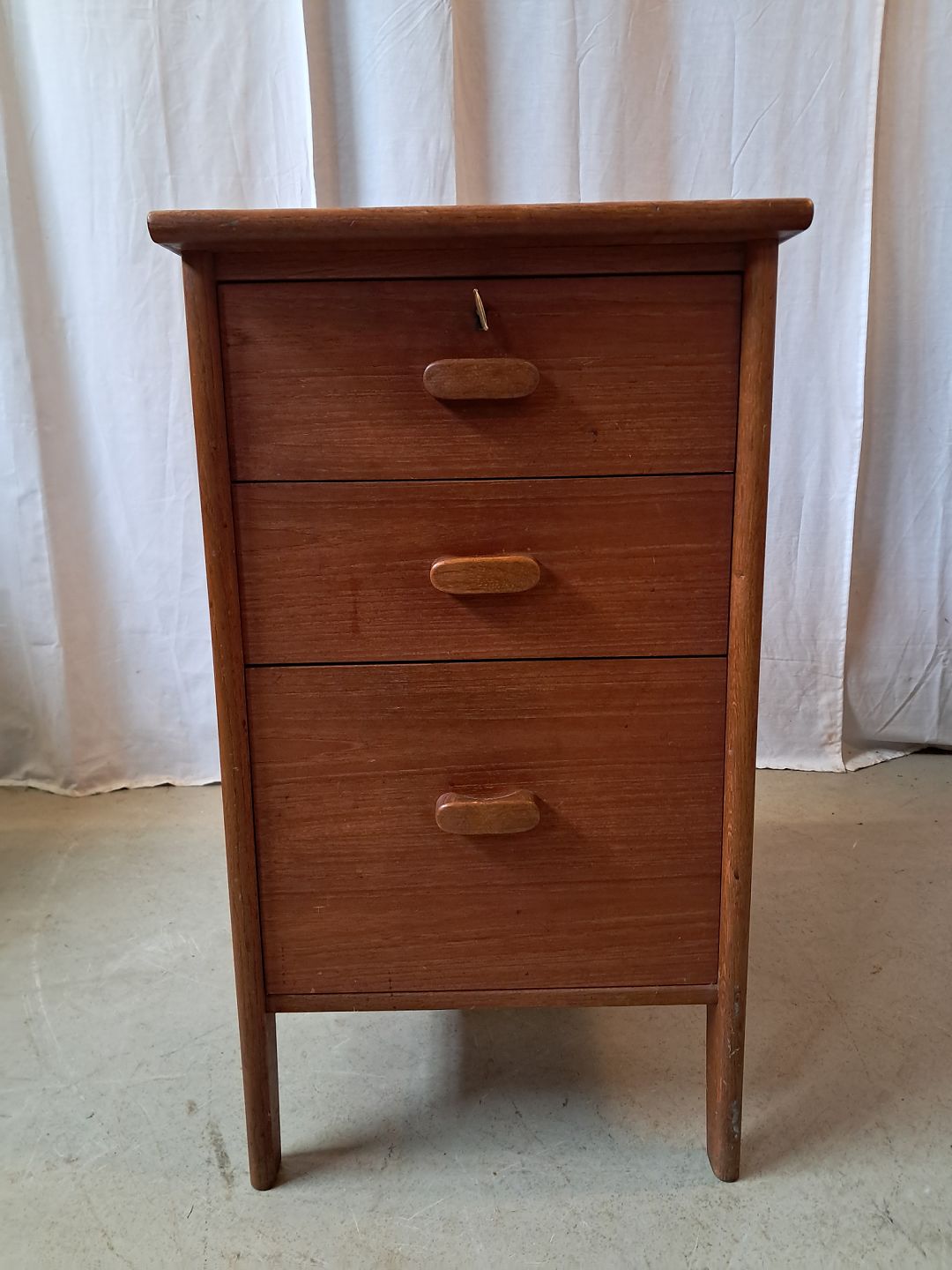 Kommode i massivt egetræ og fineret teaktræ, fra 19670erne.Den har brugsspor.