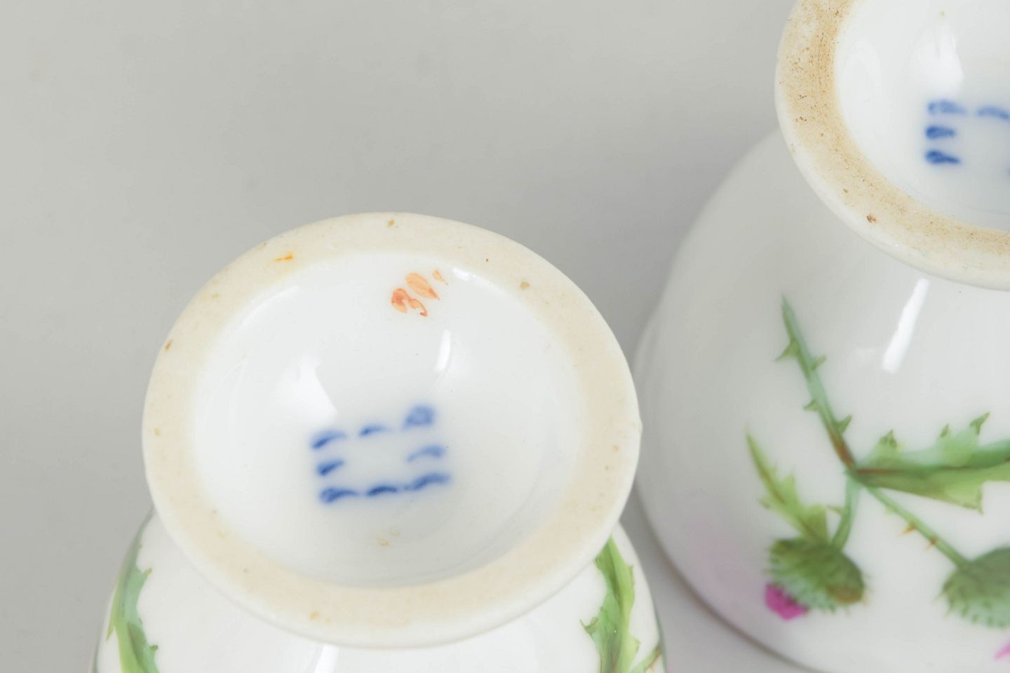 Royal Copenhagen "Tidsel", 2 æggebægre.To æggebægre i håndmalet porcelæn med motiv fra Tidsel serien. Dekoreret med tidselblomst i grønne og rosa nuancer samt forgyldt kant. Første sortering.