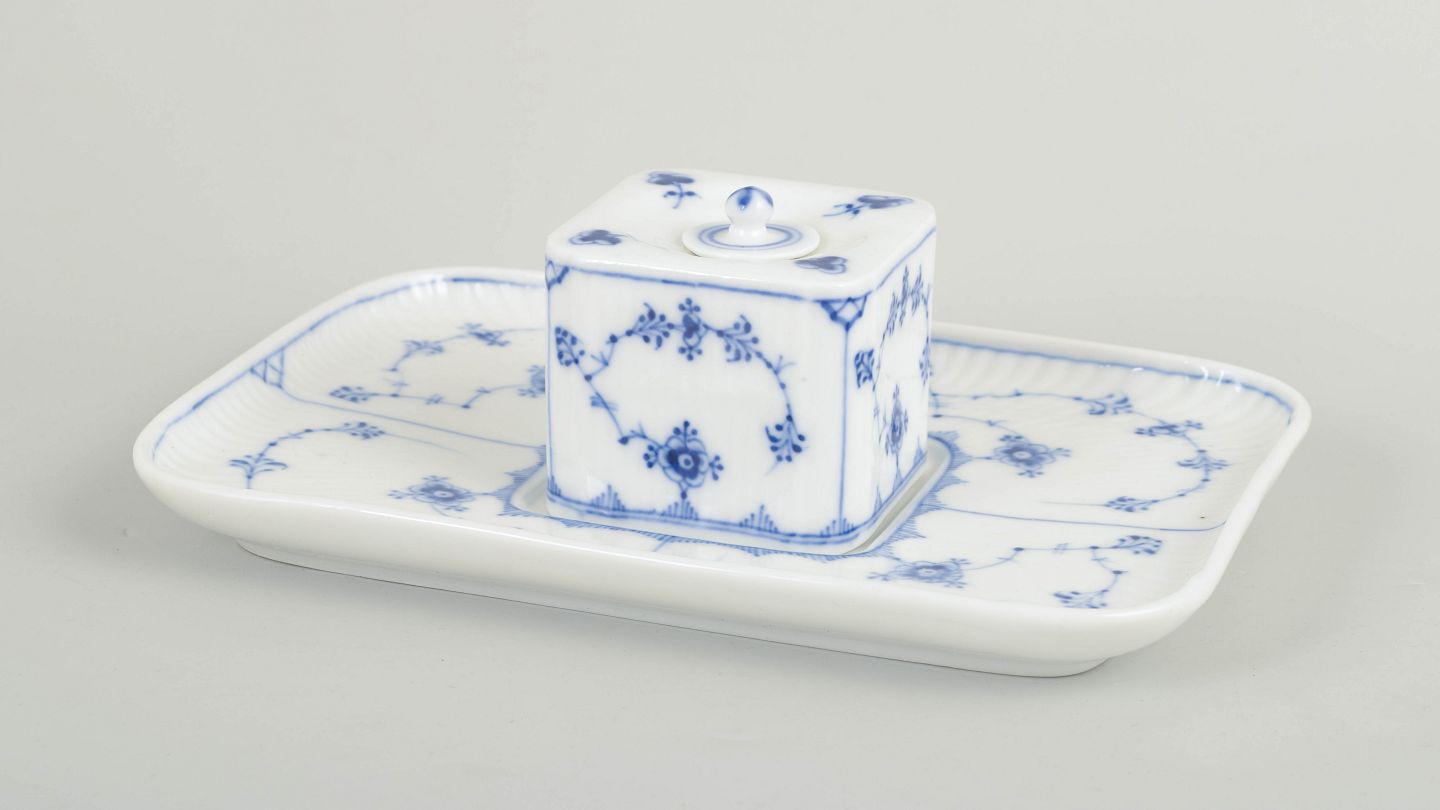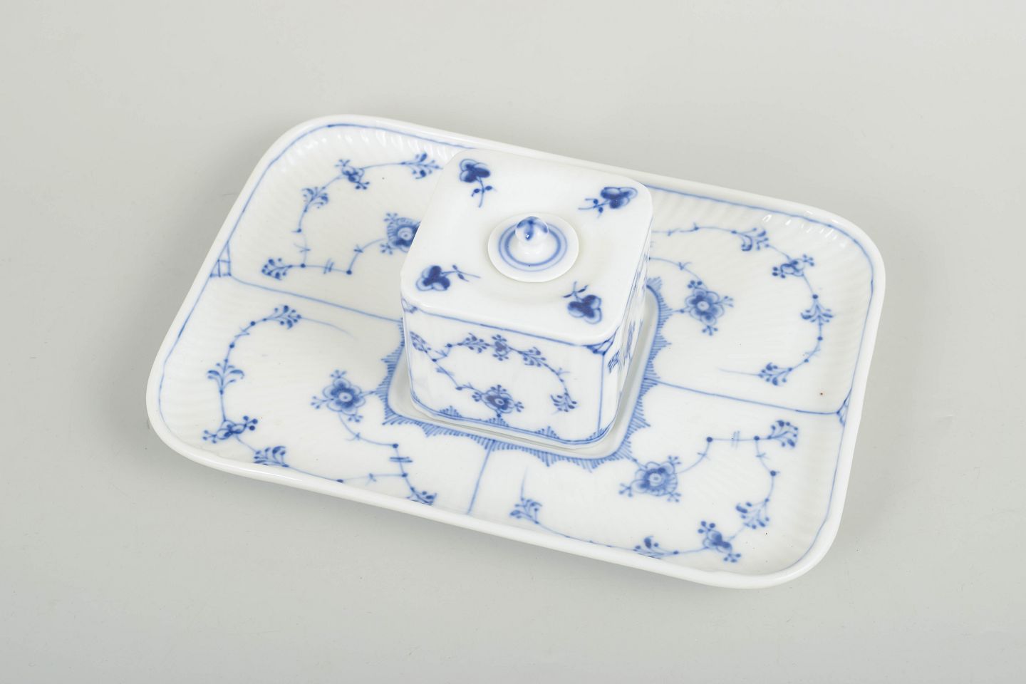 Royal Copenhagen blev grundlagt i 1775 og er en af Europas ældste porcelænsfabrikker. Musselmalet Riflet er fabrikkens mest ikoniske stel, introduceret i 1700-tallet og kendetegnet ved den riflede form og den håndmalede blå dekoration. Omkring år 1900 fremstillede fabrikken også skrivebordsgenstande som blækhuse i samme klassiske dekoration, udført med stor præcision og håndværksmæssig kvalitet.