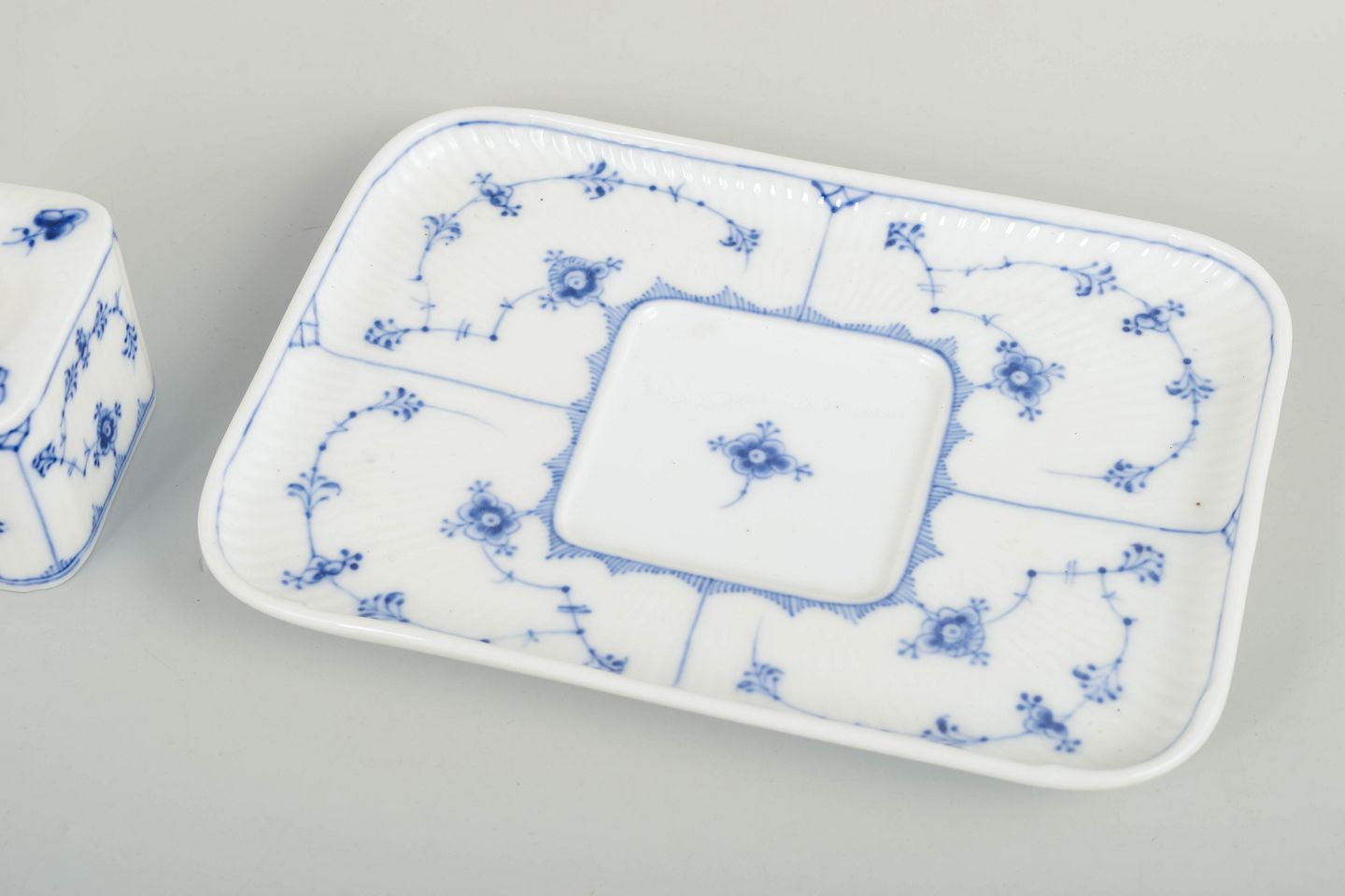 Rektangulært blækhus med fastmonteret firkantet blækbeholder og låg i hvidglaseret porcelæn med håndmalet blå underglasurdekoration i Musselmalet Riflet, model 1/128. 1. sortering.