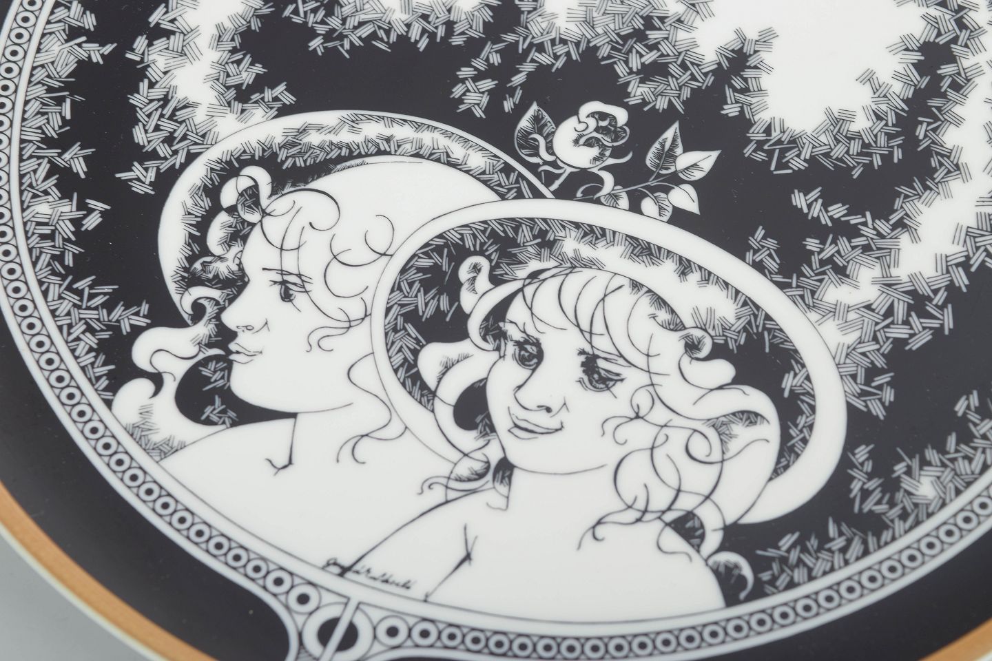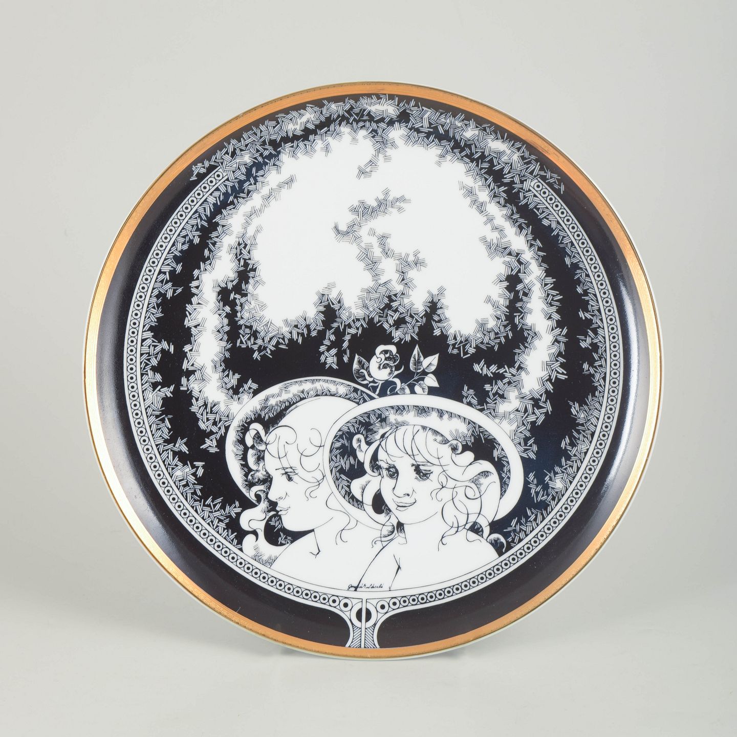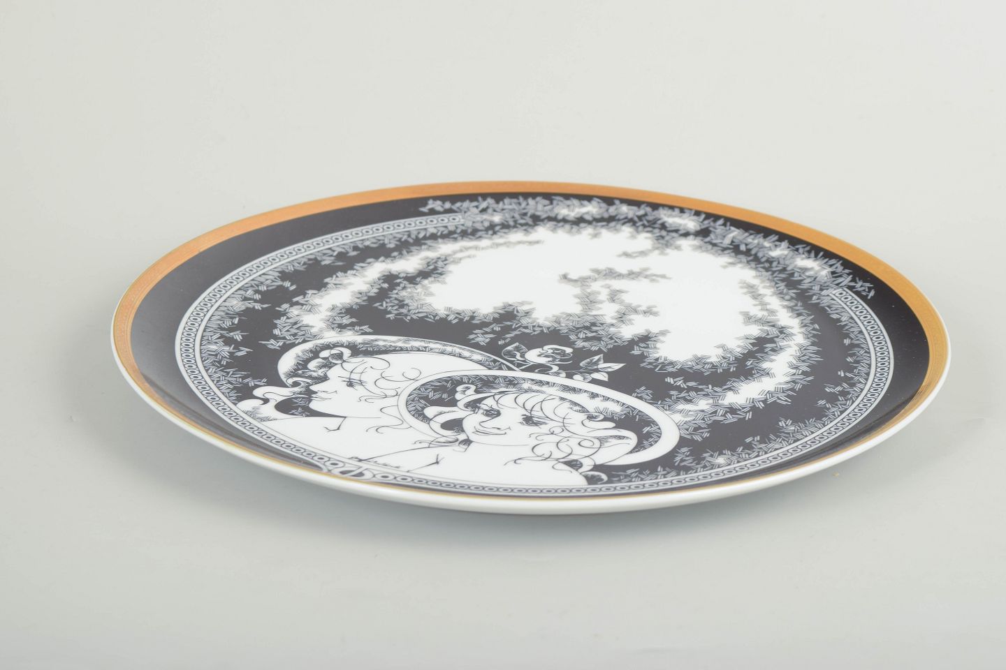 Hollóháza, stort fad.Stort rundt fad i hvidglaseret porcelæn med sort dekorationsbort og figurmotiv på låget. Fremstillet hos Hollóháza Porcelænsmanufaktur.