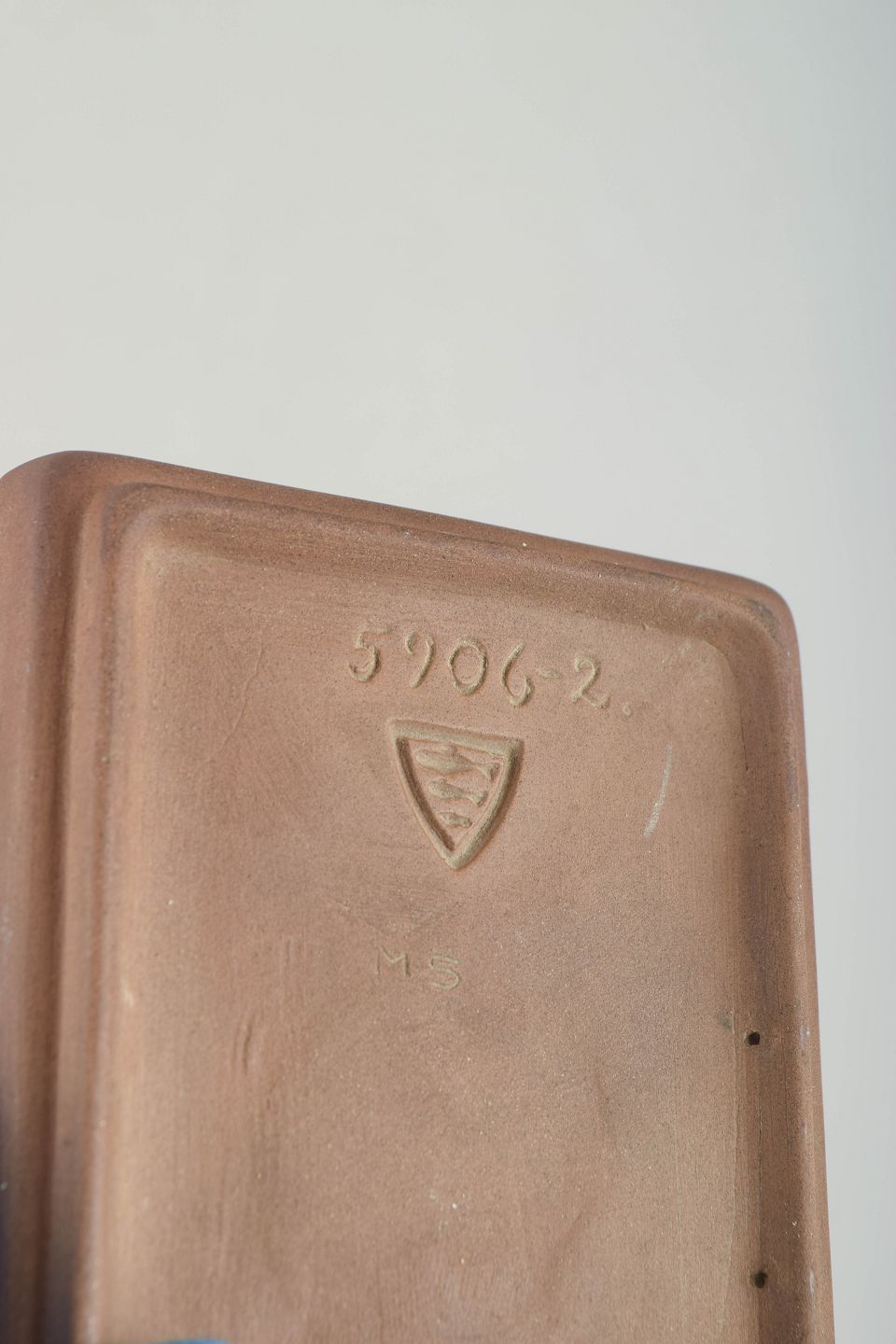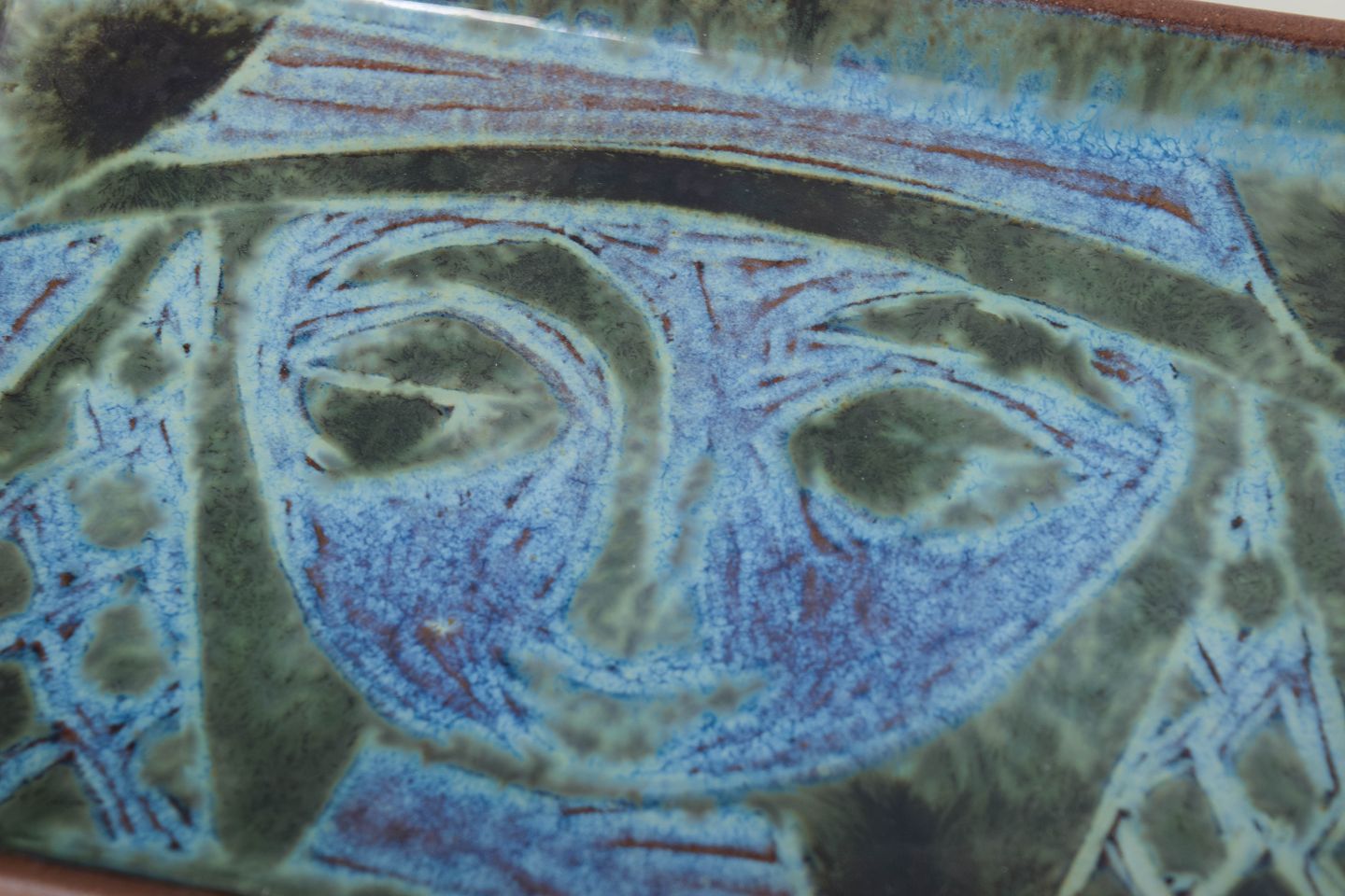 Marianne Starck for Michael Andersen & Søn, rektangulært fad/vægrelief.Rektangulært stentøjsfad med reliefdekoration forestillende stiliseret ansigt. Udført i brunligt stentøj med blå og grøn glasur i fordybningerne. Model 5906.