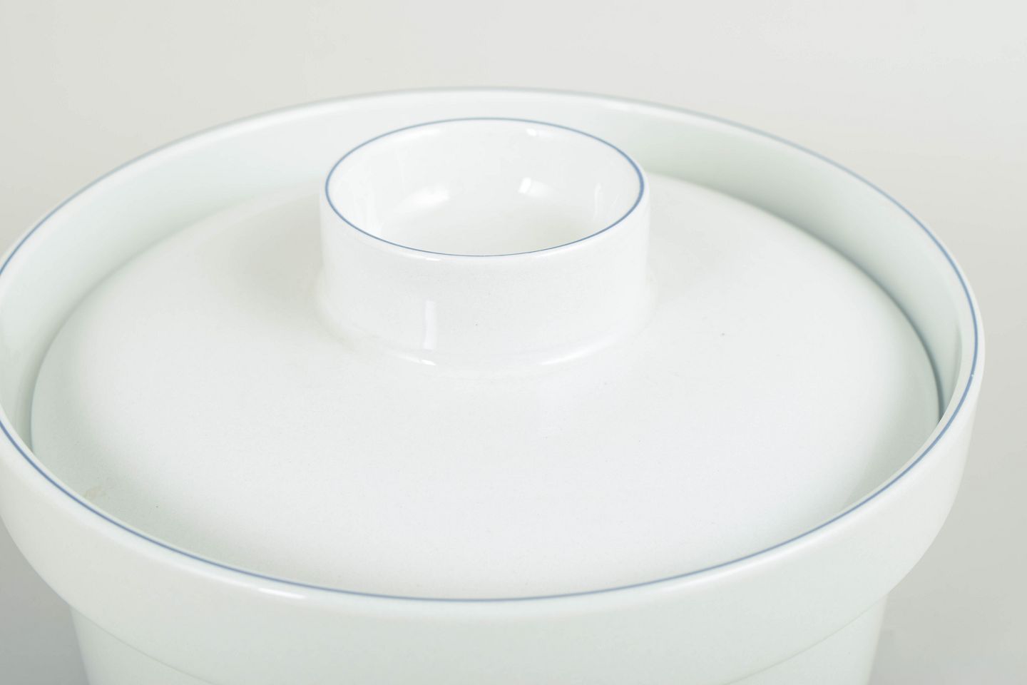 Grethe Meyer for Royal Copenhagen, lågterrin Blåkant.Lågterrin model 174 i hvid fajance med enkel blå rand langs låg og kant. En del af Blåkant-serien med sit stringente og funktionelle formsprog. Fremstillet 1992–1999. 1. sortering.