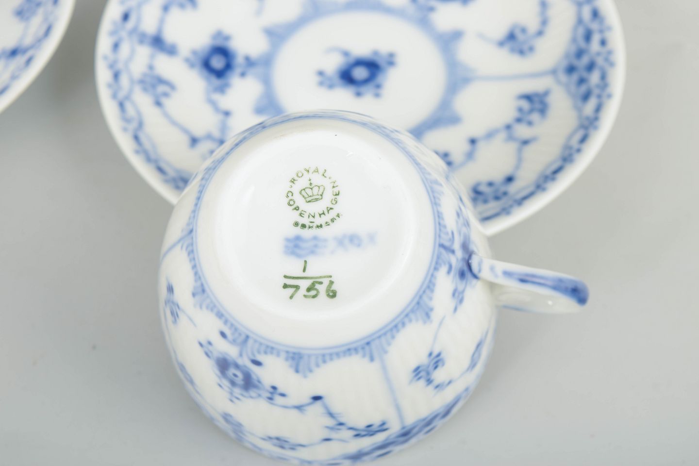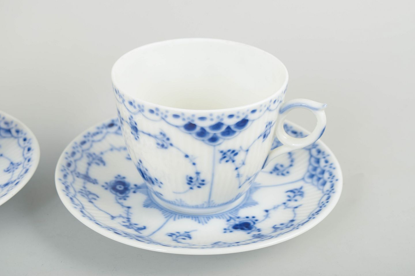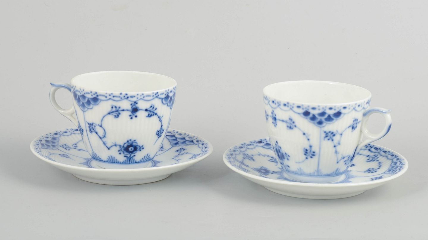 Royal Copenhagen Musselmalet Halvblonde, sæt af to kaffekopper med tilhørende underkopper.Sæt af to kaffekopper med tilhørende underkopper i håndmalet porcelæn fra Musselmalet Halvblonde med klassisk underglasurdekoration i koboltblå, riflede felter og karakteristisk blondekant. Model 1/756. Første sortering. Fremstillet 1966.
