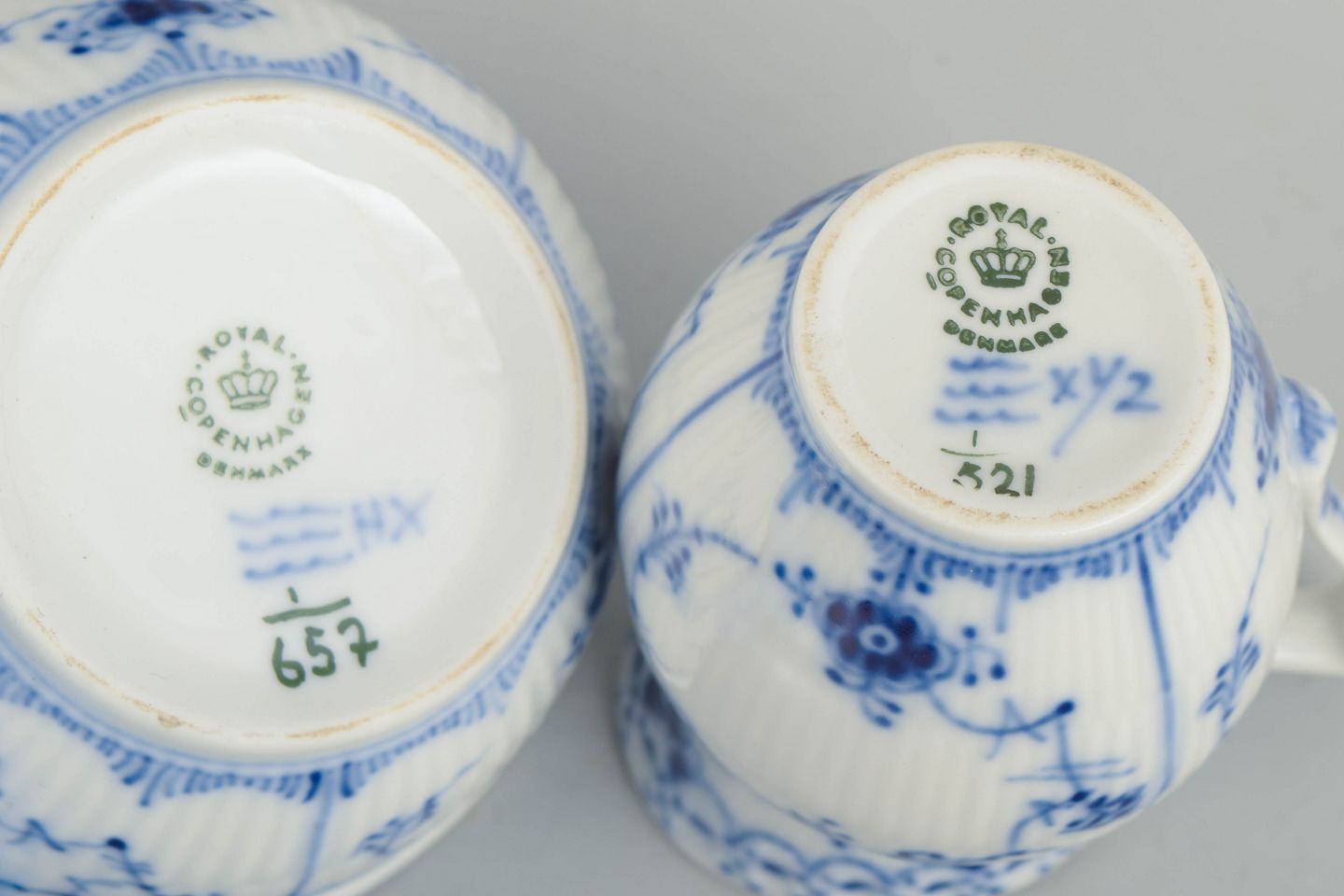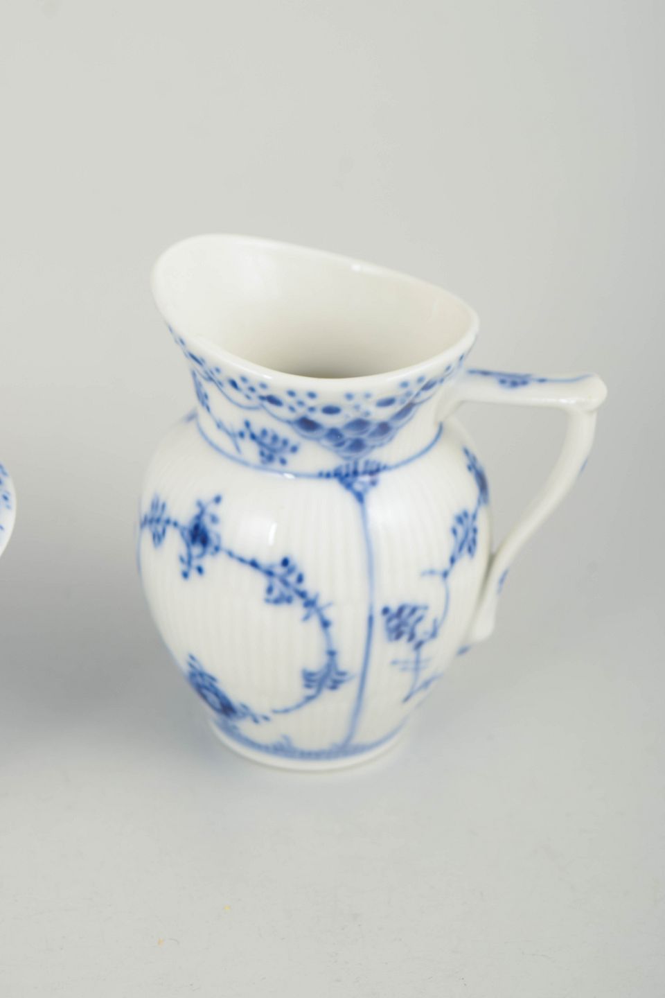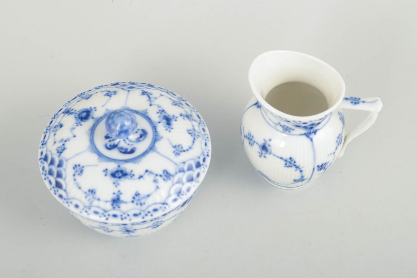Royal Copenhagen Musselmalet Halvblonde, sukkerskål og flødekande.Sukkerskål med låg og flødekande i håndmalet porcelæn fra Musselmalet Halvblonde med klassisk underglasurdekoration i koboltblå, riflede felter og karakteristisk blondekant. Modeller 1/657 og 1/521. Første sortering. Fremstillet 1963.