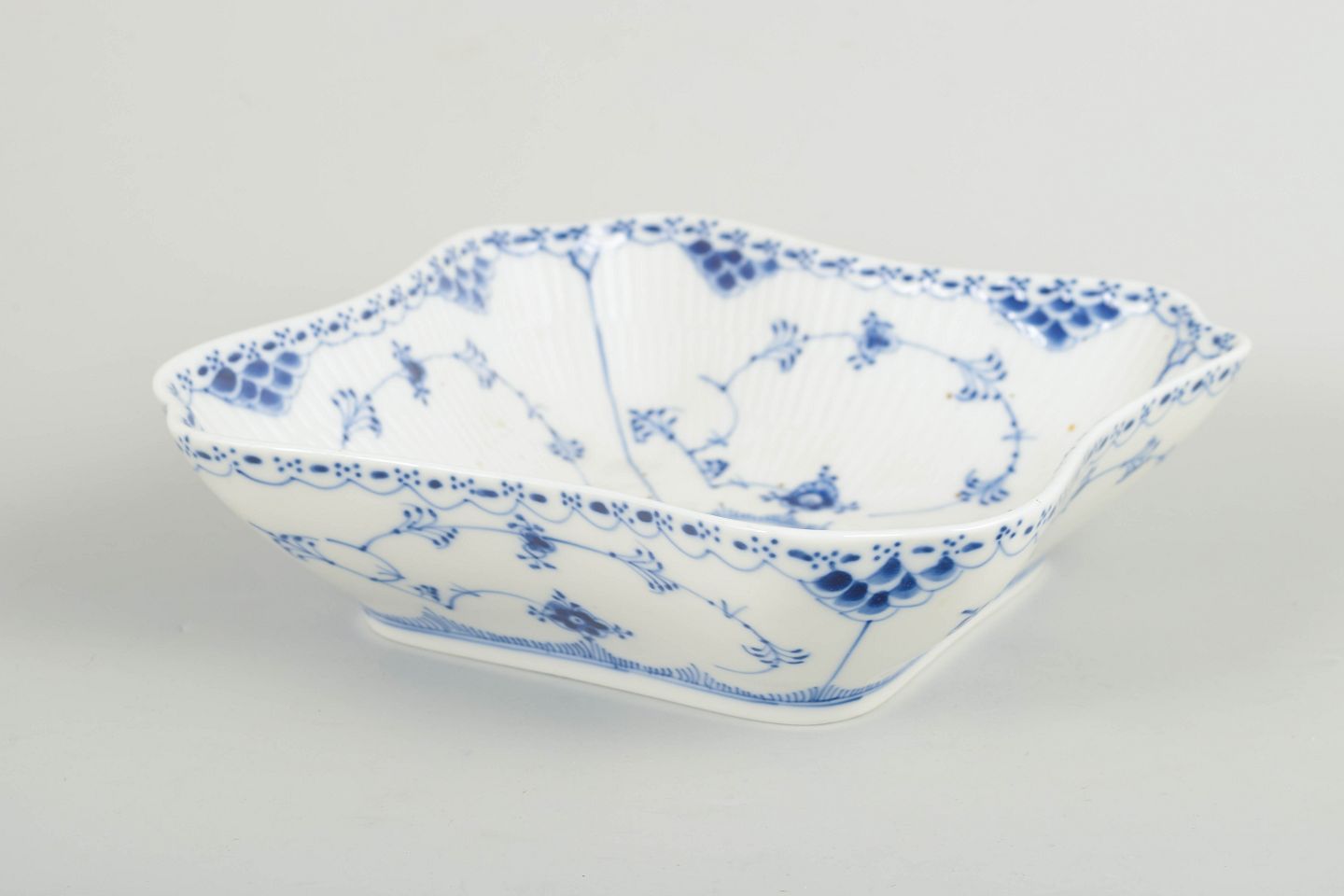 Firkantet fad i håndmalet porcelæn fra Musselmalet Halvblonde med klassisk underglasurdekoration i koboltblå, riflede felter og karakteristisk blondekant. Model 1/708. Første sortering. Måler H. 6 cm, B. 22 cm. Fremstillet 1965.