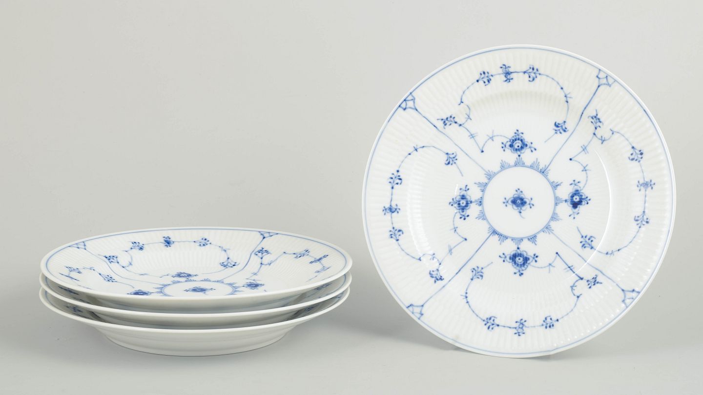 Royal Copenhagen Musselmalet Riflet, sæt af fire middagstallerkener.Sæt af fire middagstallerkener i håndmalet porcelæn fra Musselmalet Riflet med klassisk underglasurdekoration i koboltblå. Model 1/175. Første sortering. Hver tallerken måler 26 cm i diameter. Fremstillet 1967.
