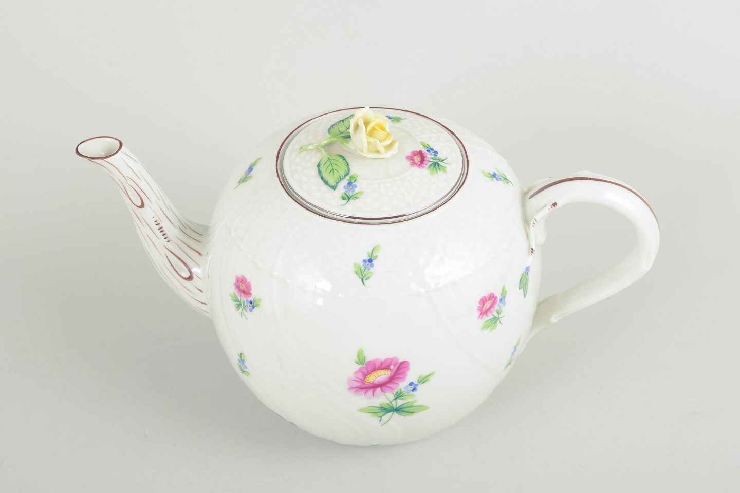 Herend, tekande.Tekande i håndmalet porcelæn fra Herend. Dekoreret med naturalistiske blomster i rosa og blå nuancer samt fine grønne blade. Låget afsluttes med knop formet som en gul rose. Fabriksmærket i blåt under bunden.