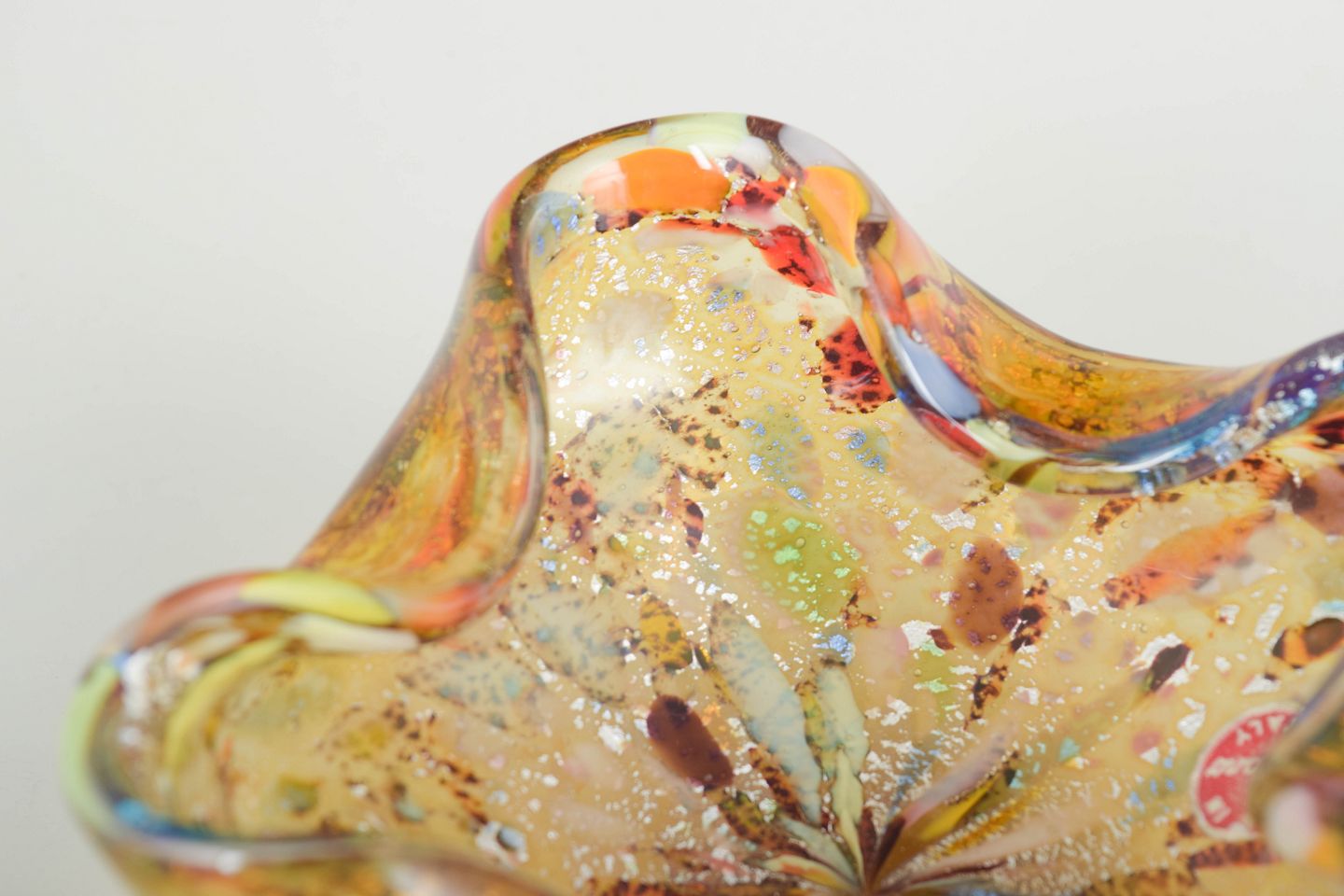Murano skål, organisk form.Organisk formet skål i mundblæst glas med bølgende kant. Udført i gyldne og ravfarvede toner i aventurin teknik, flerfarvede indeslutninger. Mærkat bevaret. Fremstillet på Murano i 1960’erne/70’erne.