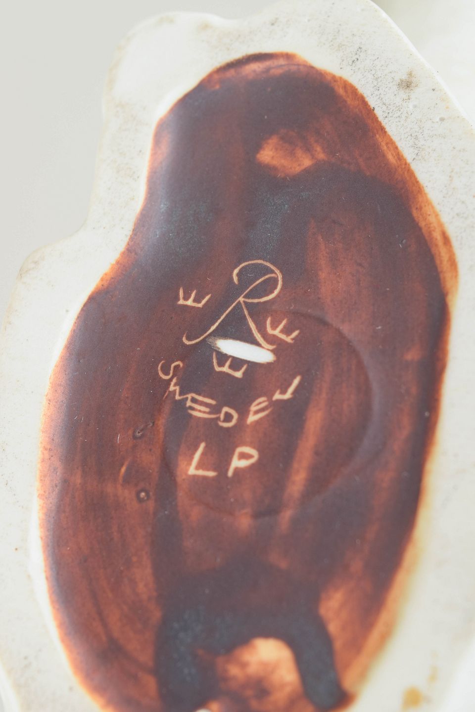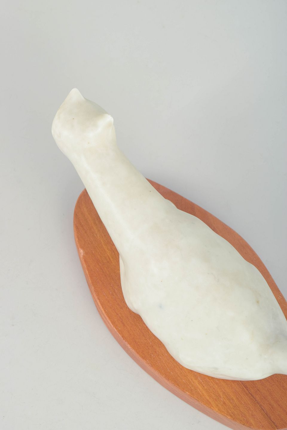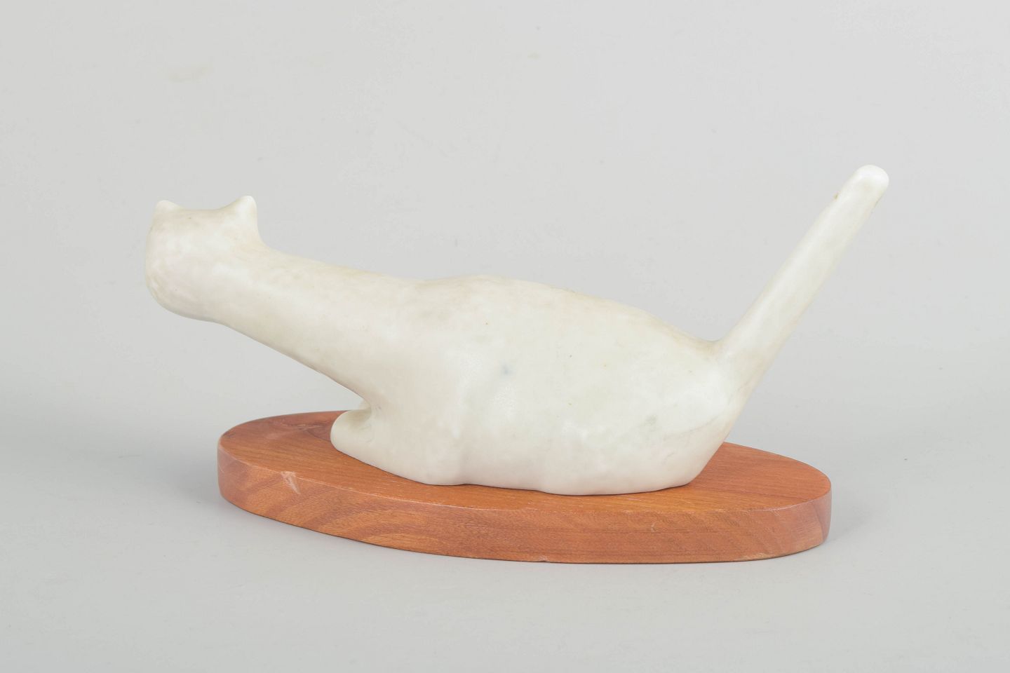 Lillemor Petersson for Rörstrand, kattefigur i stentøj på træfod.Naturalistisk udformet kat i hvidt stentøj med stiliseret, langstrakt krop og løftet hale. Figuren står på en oval træfod og fremstår med enkel, modernistisk formgivning karakteristisk for Rörstrands produktion i midten af det 20. århundrede.
