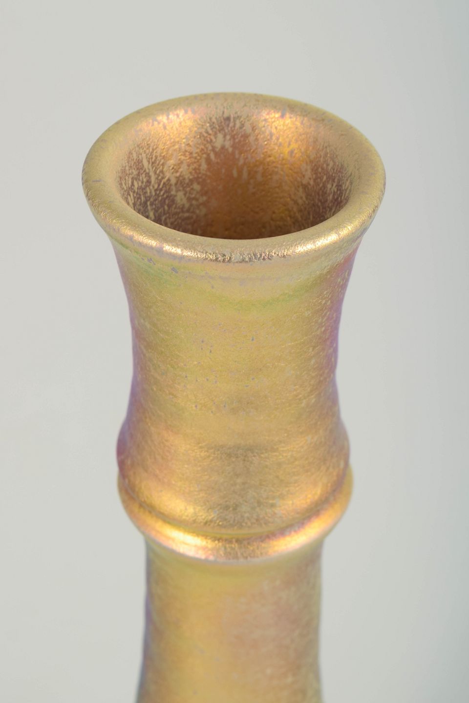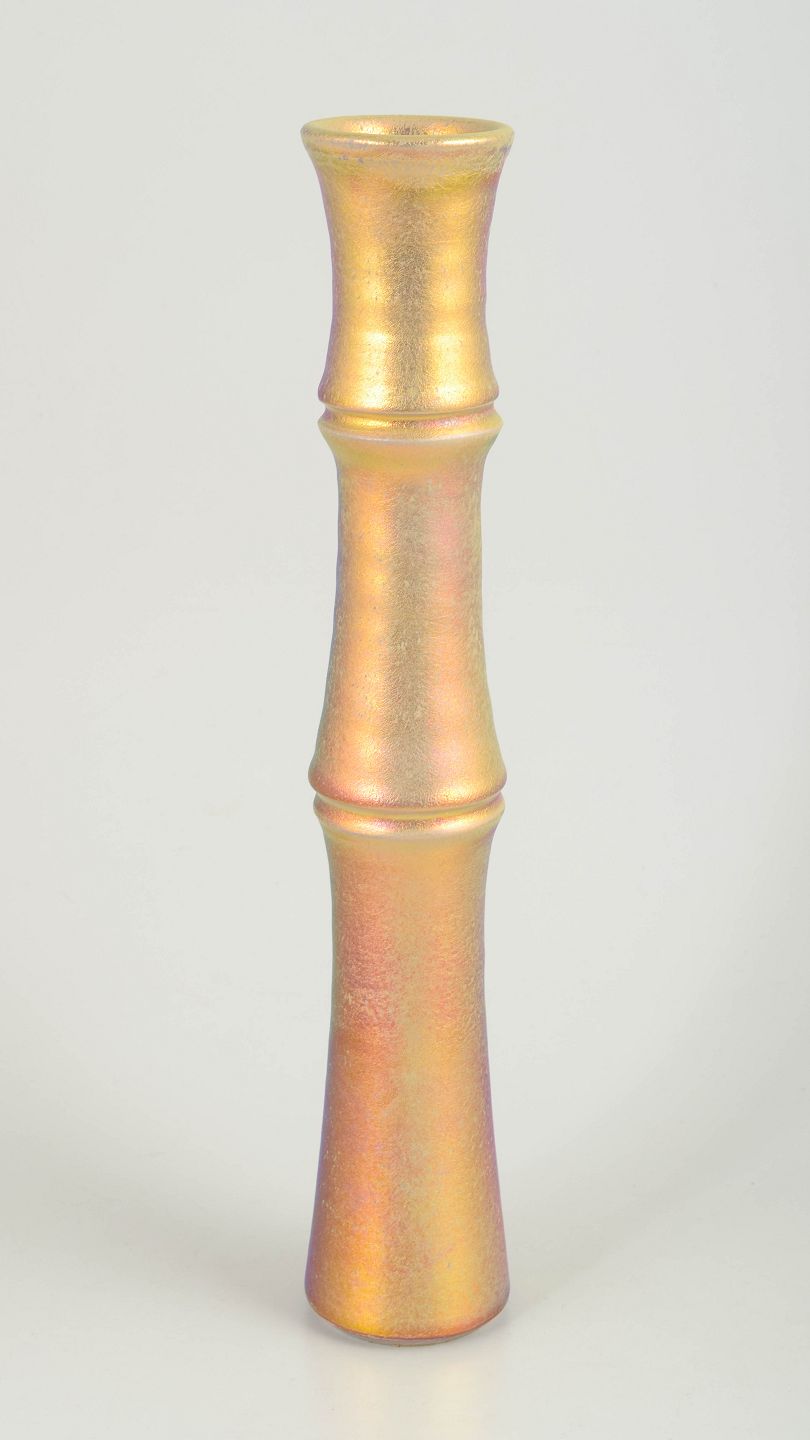 Mobach, Holland, høj vase i stentøj.Slank og arkitektonisk udformet vase i stentøj med metallisk, iriserende glasur i gyldne og kobberfarvede nuancer. Vasen har markerede profilerede led og er signeret under bunden.