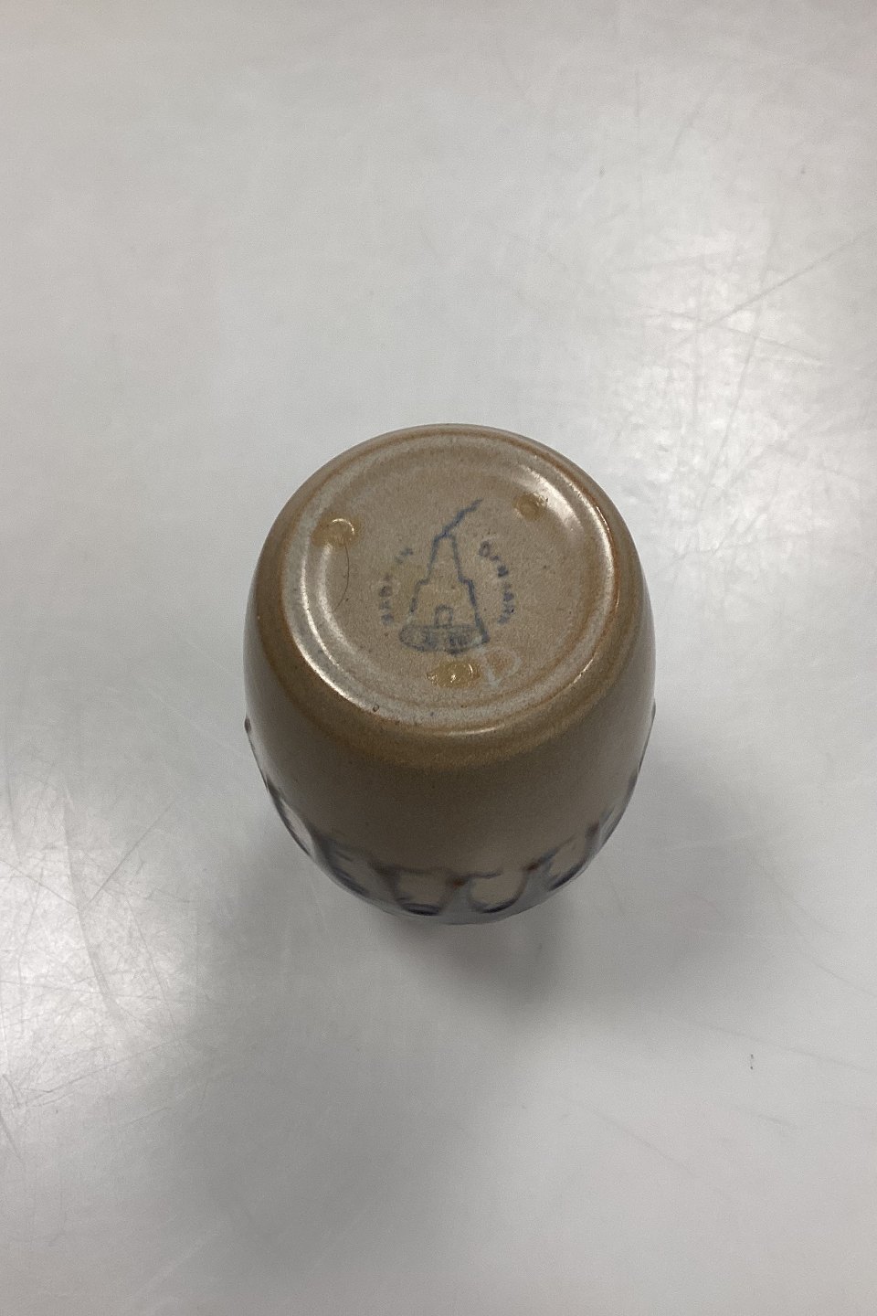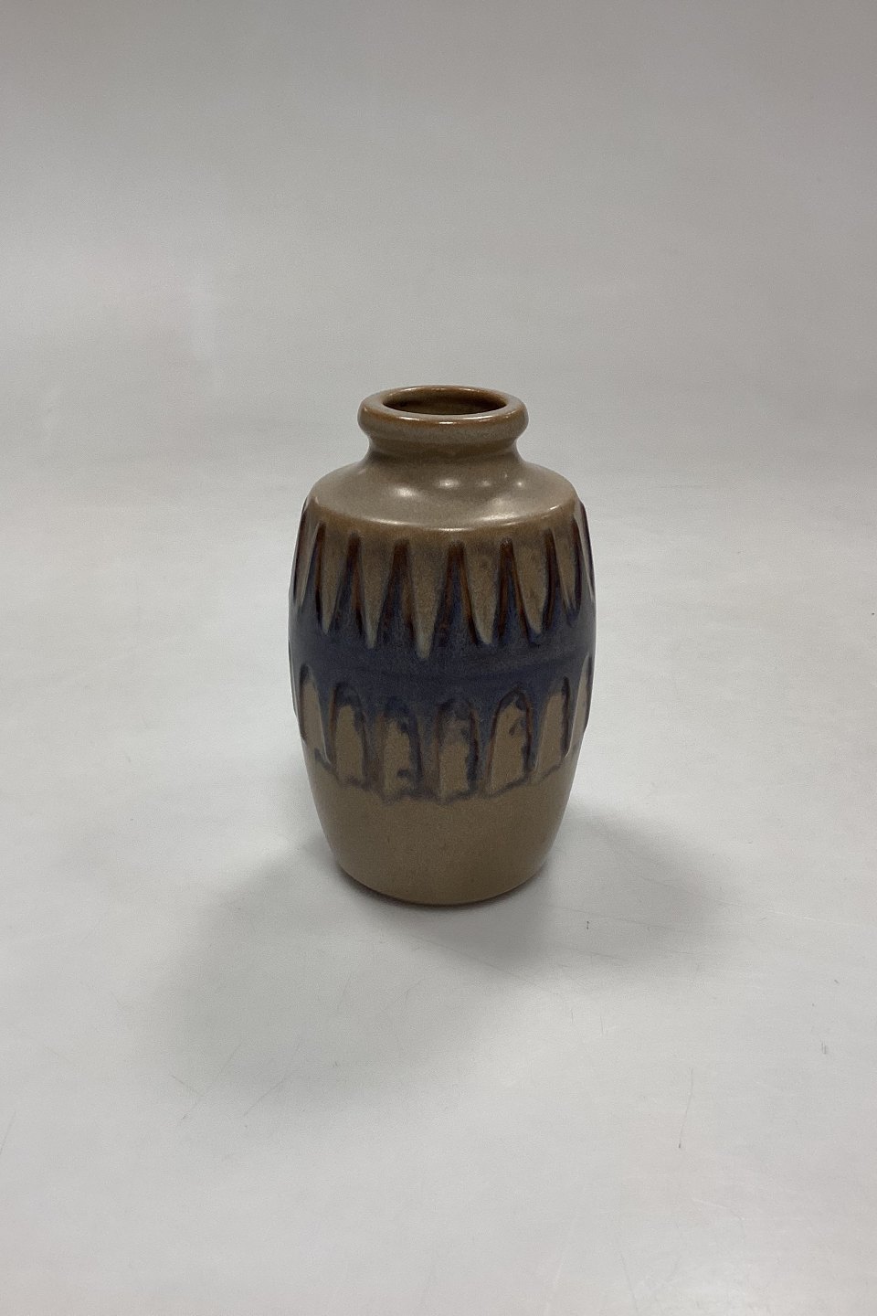 L. Hjort Keramik Vase. Beige, brun og blå glasur med moderne grafisk dekoration.Måler 12,3 cm / 4,84 in.