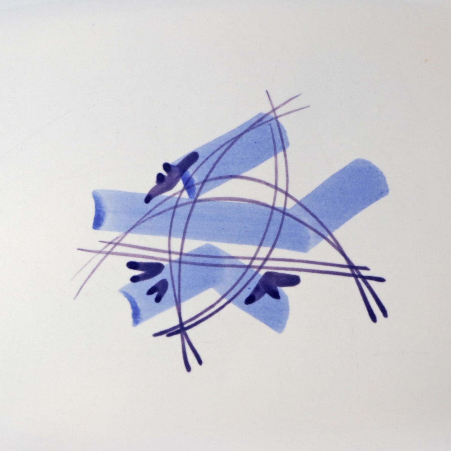 Fajancestel i stelform CA med dekoration af abstrakt motiv i blå og lyseblå på en råhvid baggrund.
