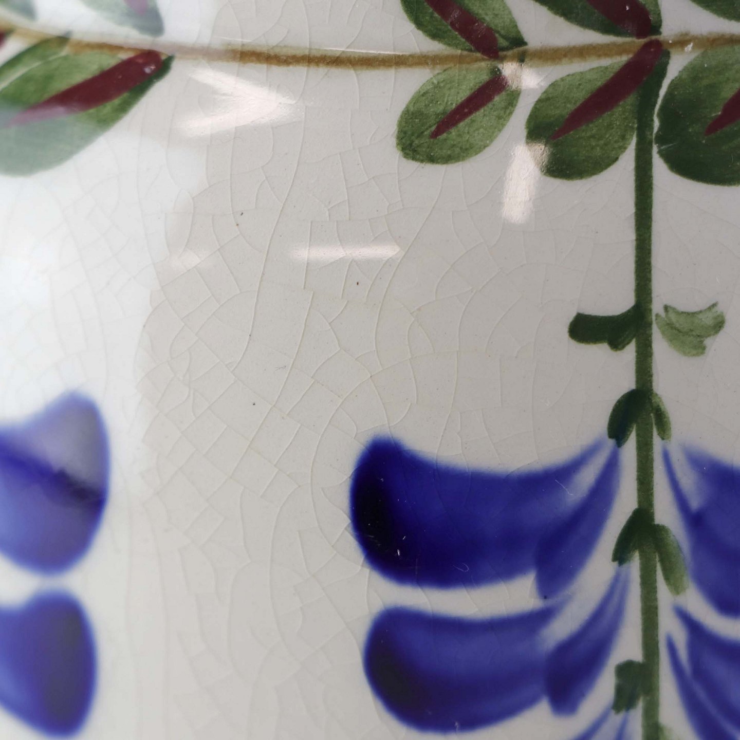 Fajancestel med dekoration af ranker af blåregn og blade på lys baggrund afsluttet med kant af runde blå pletter.