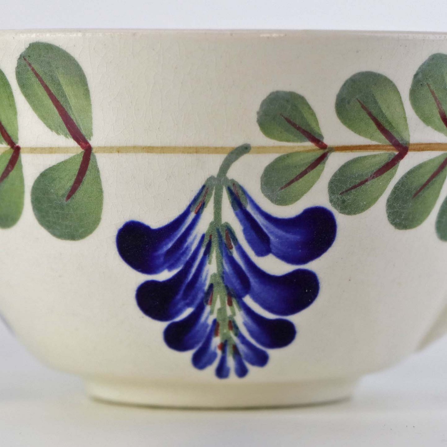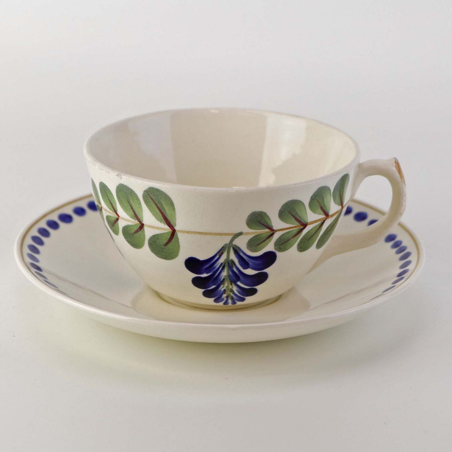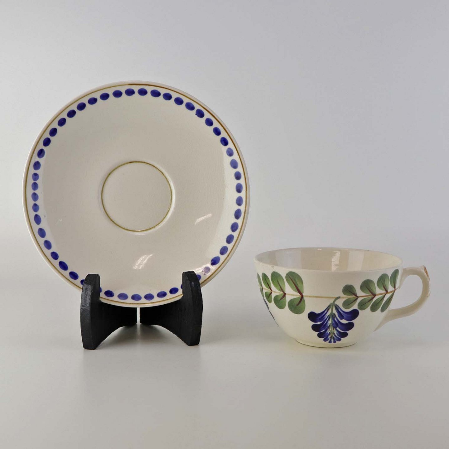 Fajancestel med dekoration af ranker af blåregn og blade på lys baggrund afsluttet med kant af runde blå pletter.