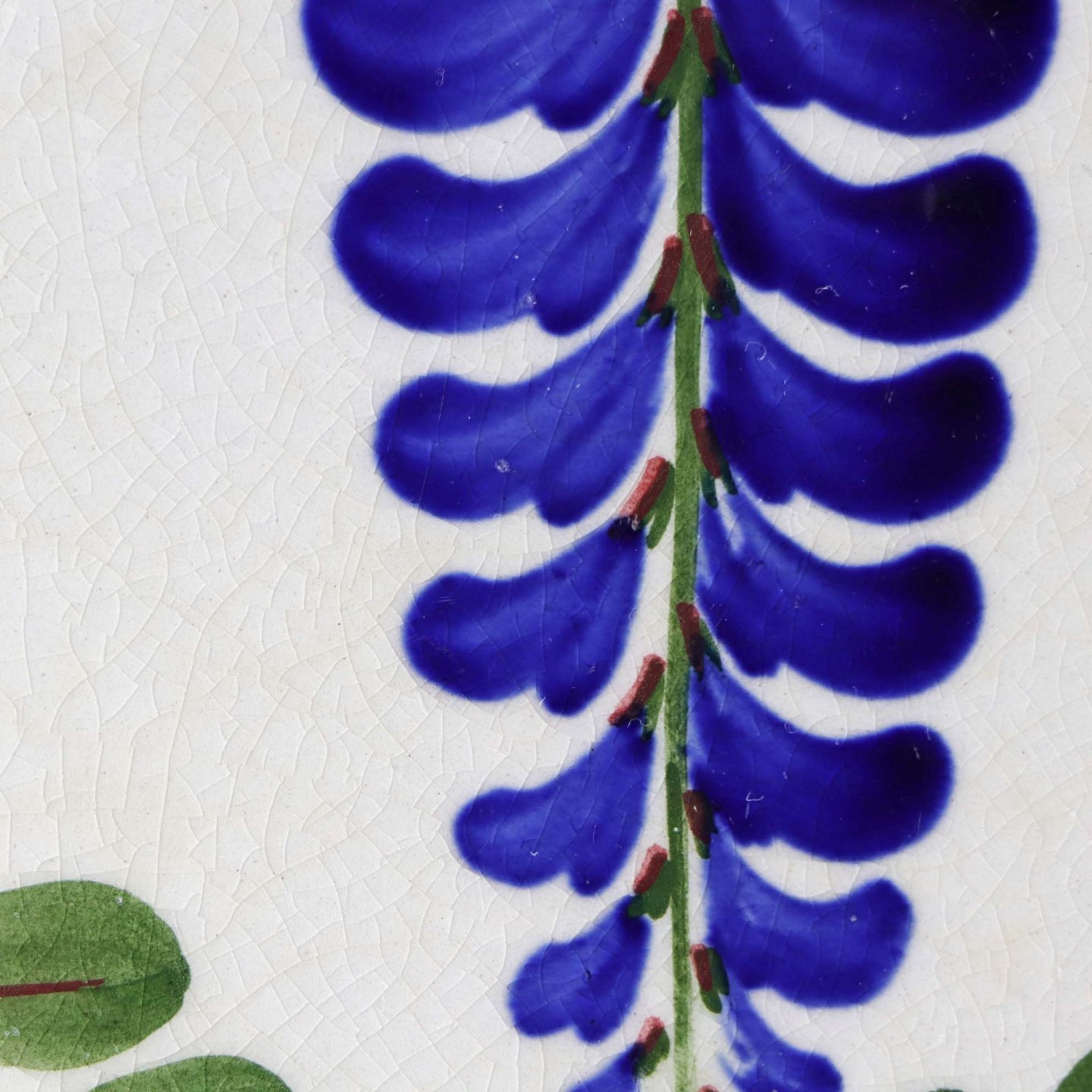 Fajancestel med dekoration af ranker af blåregn og blade på lys baggrund afsluttet med kant af runde blå pletter.