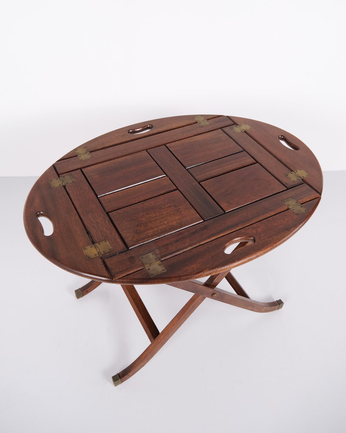 Butlerbord fra 1940’erne i mahogni med messingbeslag. Klassisk serveringsbord med aftagelig bakke og elegant design.— Oprindelse: England