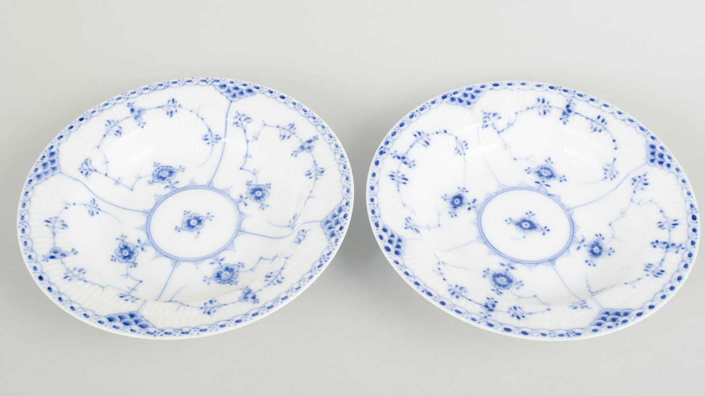 Royal Copenhagen Musselmalet Halvblonde, sæt af to dybe tallerkener.Sæt af to dybe tallerkener i håndmalet porcelæn fra Musselmalet Halvblonde med klassisk underglasurdekoration i koboltblå, riflede felter og karakteristisk blondekant.